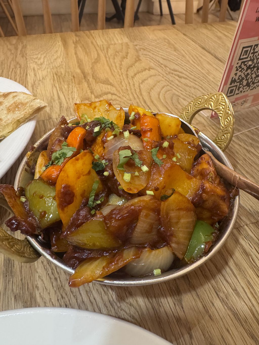 For my main, I had the chilli tofu and aloo paratha. The tofu was soft, baked, and full of flavour, and the bread was spot-on. Everything arrived together, which made for a hearty feast.