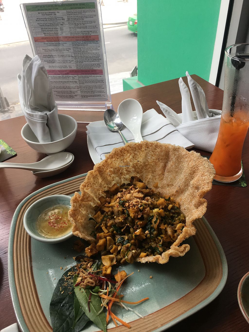 A popular lunch spot, I enjoyed a shredded papaya salad in an edible bowl made of rice flour. It was a fun interactive experience to break off parts of the bowl and place the salad on top, before eating. Also had a refreshing guava juice with no sugar. Service was attentive and friendly.