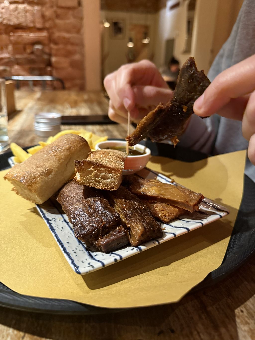 Il menù vegano ha proposte da pub, tanti piatti con costicine/hamburger/frittini ma tutto plant based. Costa, ma il cibo è molto buono e fatto con cura. Consiglio anche per il posto carino e pacifico all’aperto