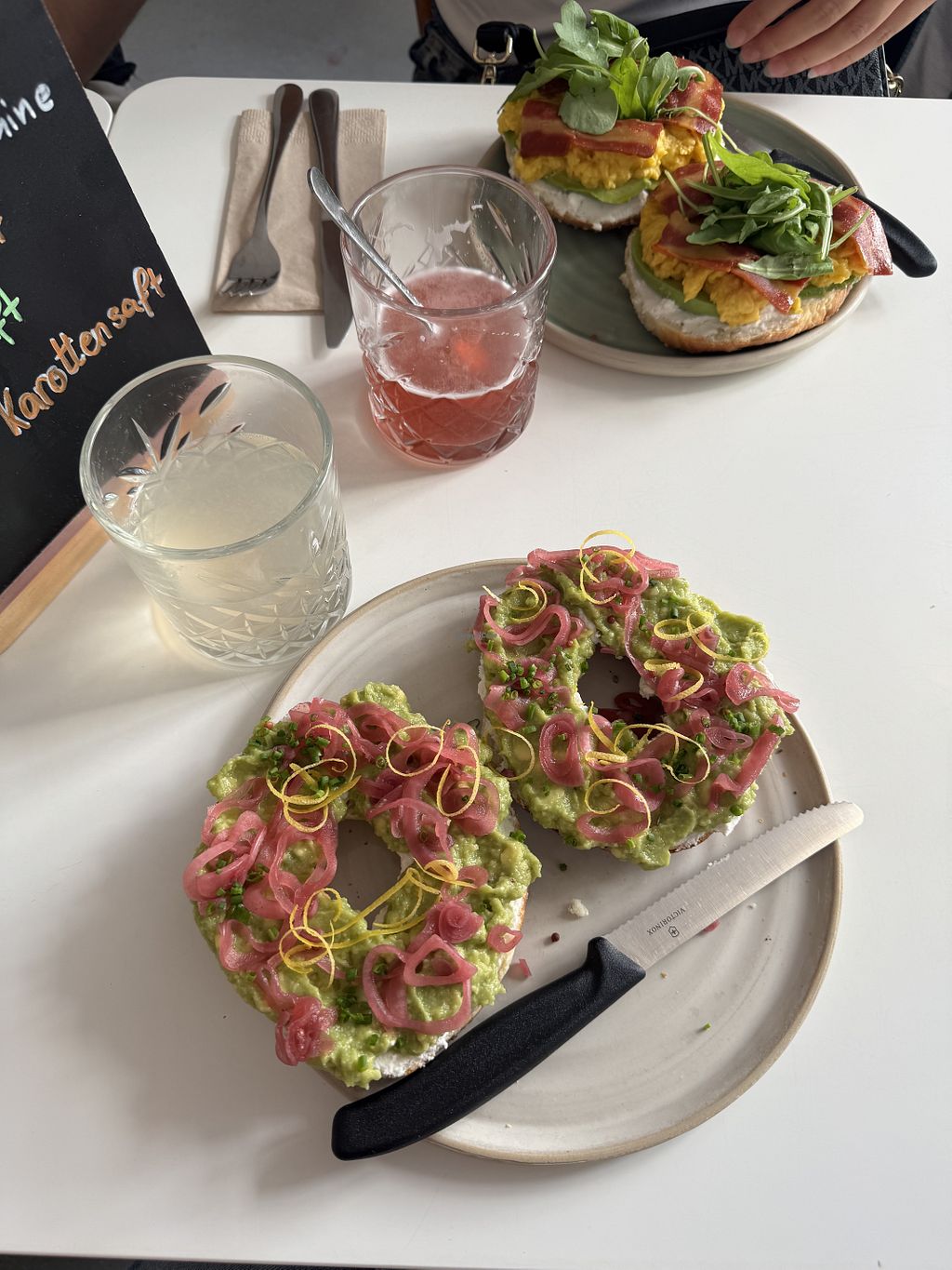 Hummus breakfast, dirty chai latte and apple carrot juice