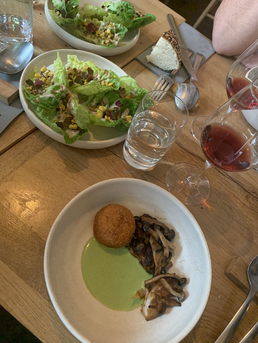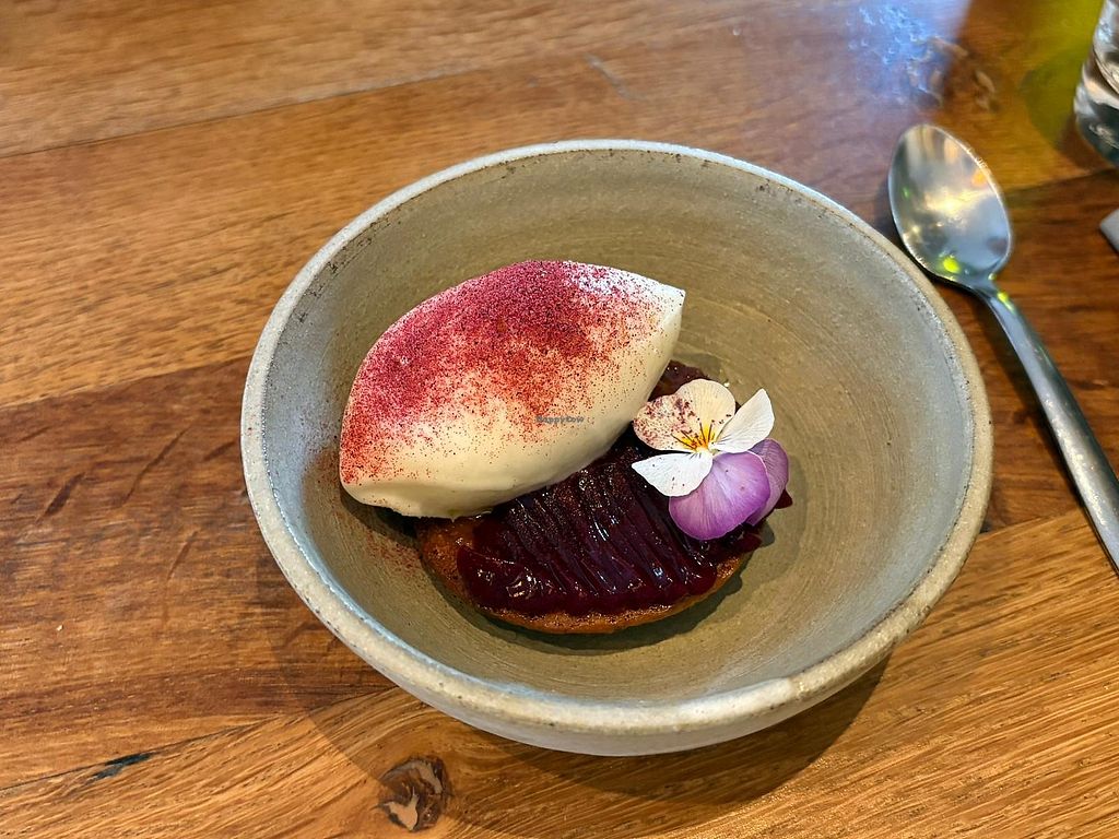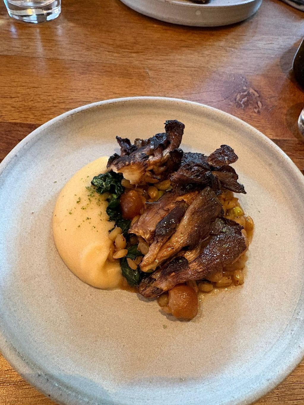Read moreWe had the 5-course tasting menu with the addition of their locally grown Lupa Fried mushrooms. Courses when we visited included a balsamic tomato with soy cream cheese and rye bread pieces appetiser; starters of milk bread, white bean puree and harissa; roasted apricots and fried aubergine on top of a minty tabbouleh; a main course of arancini with pesto and barbequed mushrooms and lettuce with Caesar dressing; and a dessert of elderflower ice cream with mixed berry coulis and mixed grain crumb.