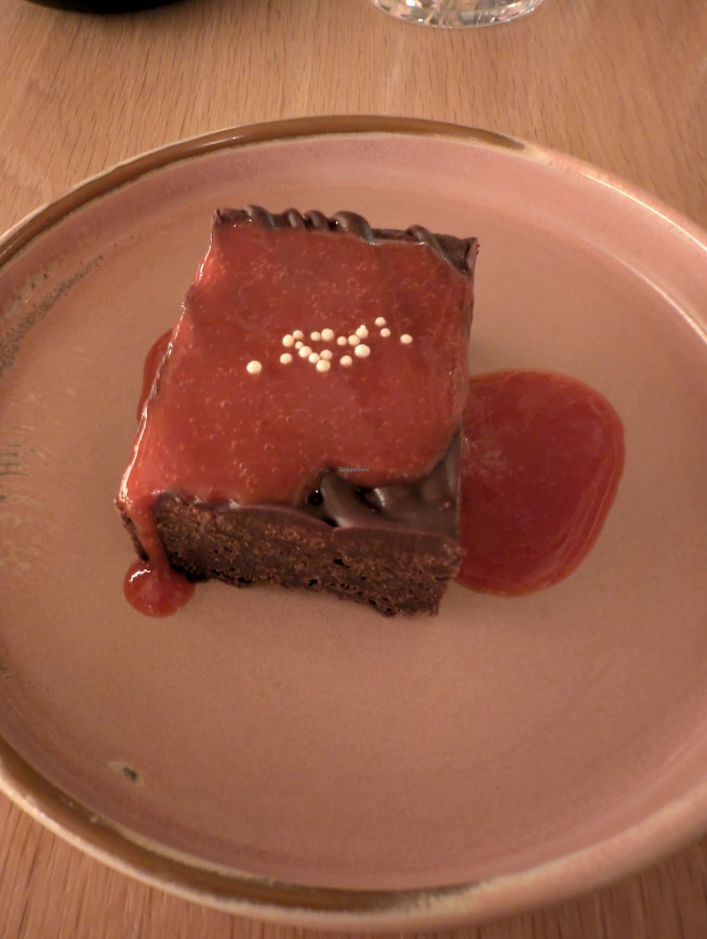 Brownie with raspberries sauce. Moist, dense, still prefer ice cream