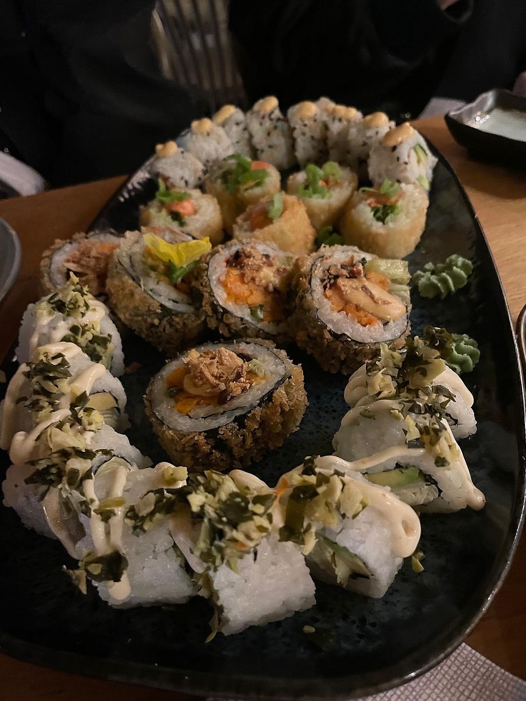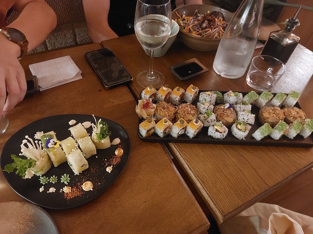 The vegan sushi was great. Nice flavours and beautiful presentation. Good range of choices. We had a bottle of wine which was lovely. Nice staff. Restaurant is nice inside, you can sit outside, but I think inside is better. Prices are ok, sushi is usually a bit more expensive than the norm anyway.