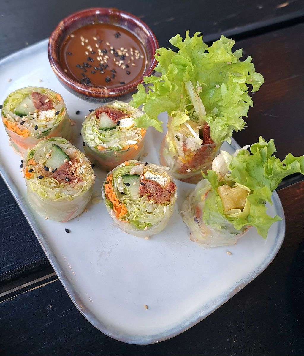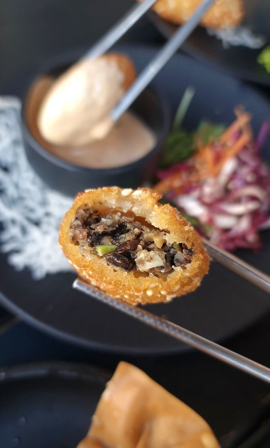 Bodhicitta vegan bowl is a wonderful place for flavor lovers. Everything we had here was excellent and very flavorful! We had the T1 Cha Gio homemade spring rolls with a sweet and sour sauce and T3 NAM CHIEN crispy Herb mushrooms with sesame, with kimchi mayonnaise dip from the tapas section and 7 PHO TIME - Warm bowl with flat rice noodles with homemade seitan, tofu, fresh lettuce, peanuts, sesame and one Kimchi sauce (usually spicy, I asked for less spicy 😁) and 9 COM Hoisin - Warm rice bowl with homemade crispy soy steak, tofu, fresh lettuces, coriander, peanuts, sesame and one Vietnamese Hoisin sauce. I also ordered the loving shake which tastes like a really sweet strawberry drink. We Loved everything we had!