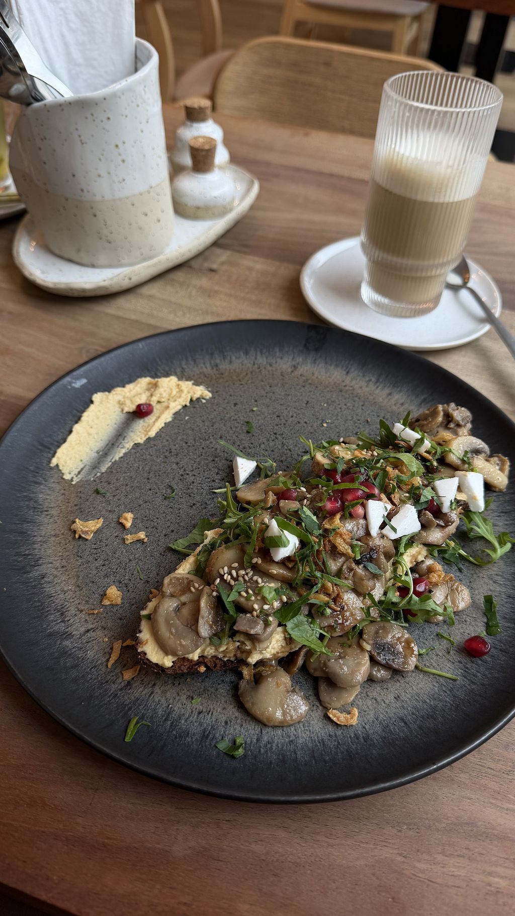 Es gibt sowohl herzhafte, als auch süße vegane Optionen und fast alle Getränke können mit Hafer oder mandelmilch gemacht werden. Ich empfehle sehr das hummus Champignons Brot.