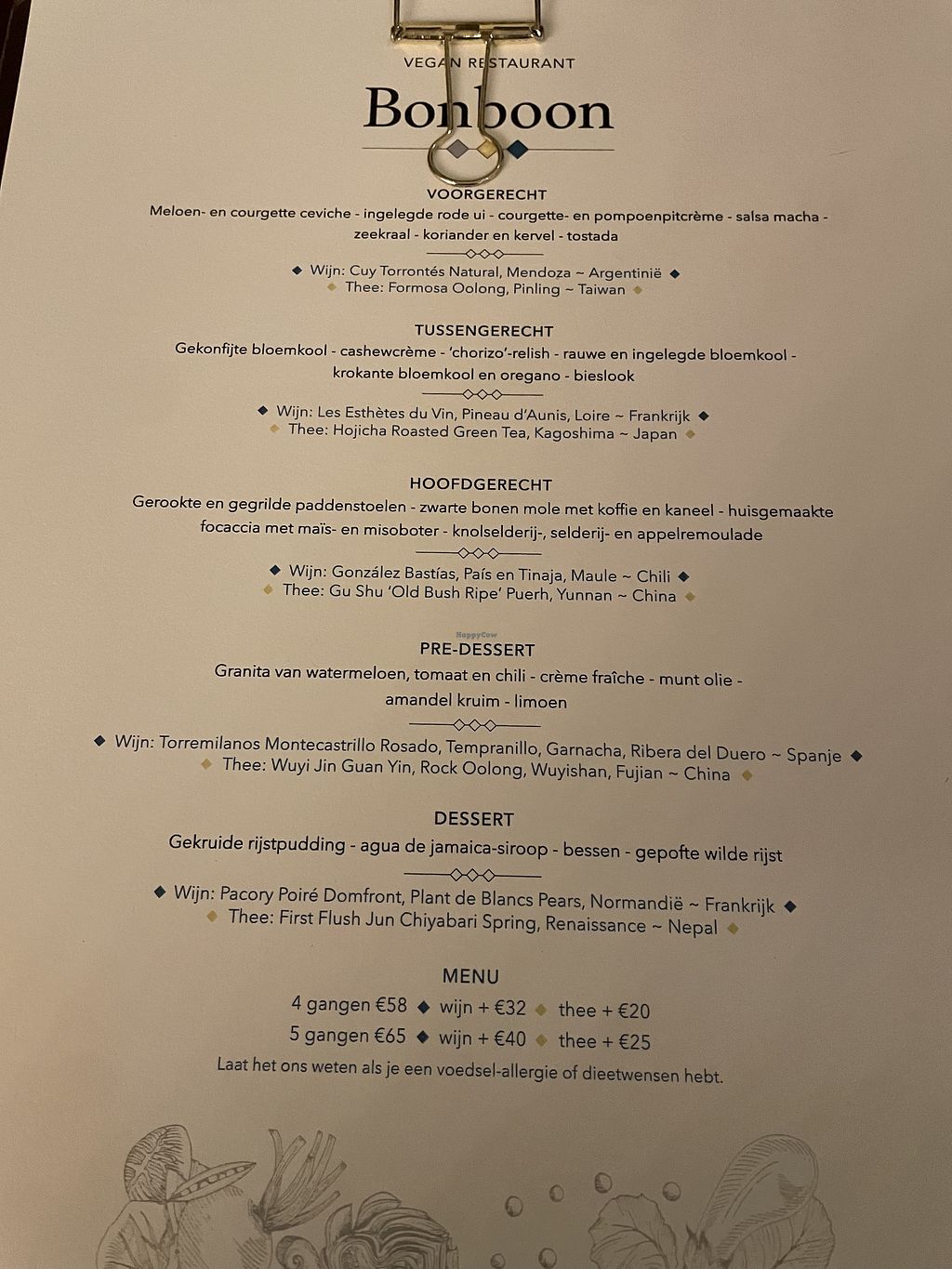 Vegan fine dining with a set 4 or 5 course menu, which you can pair with wine or tea or just pick your own drink.