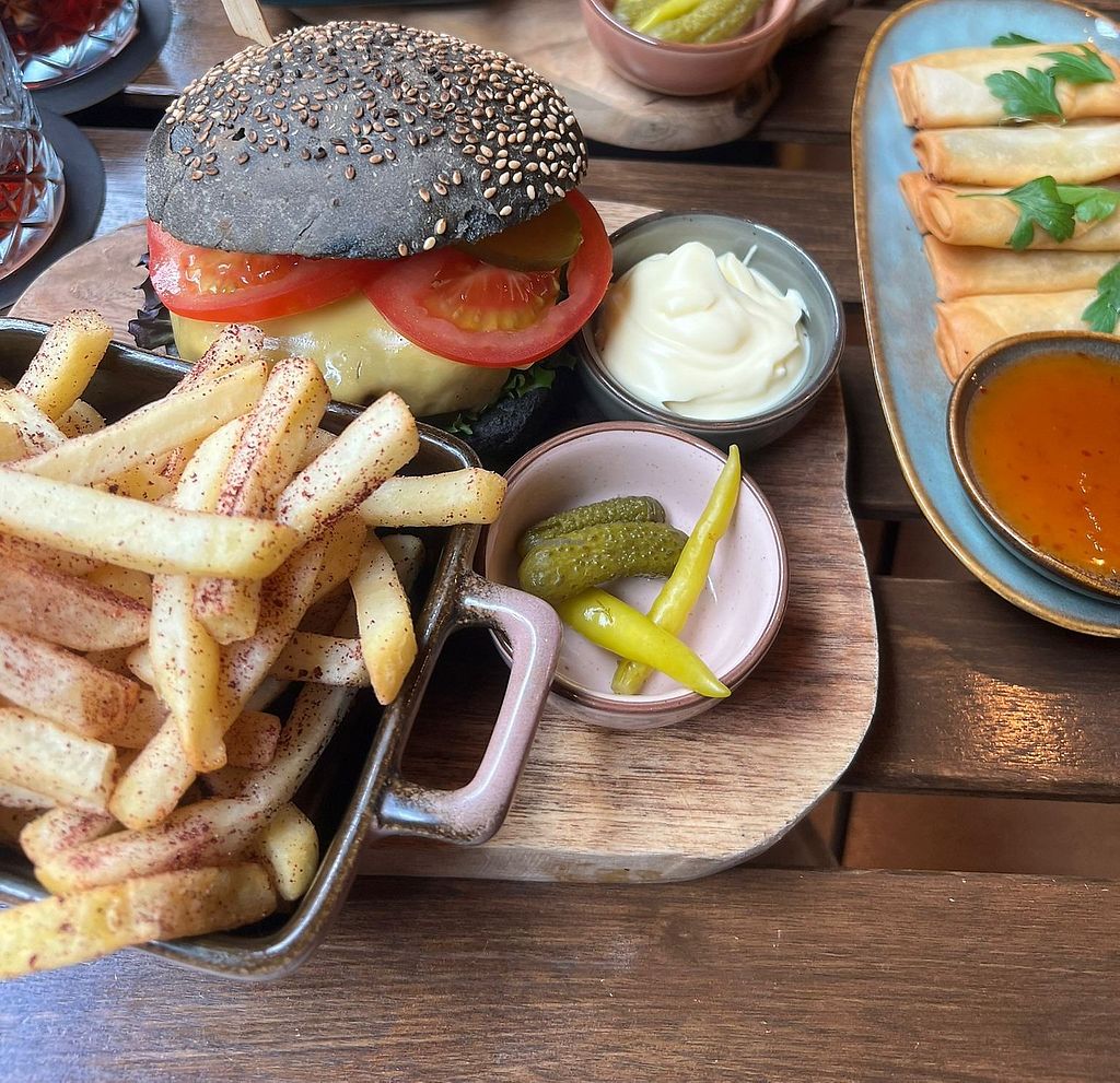 ich hatte den falafel burger mit veganem cheddar, pommes mit veganer mayo und die frühlingsrollen.