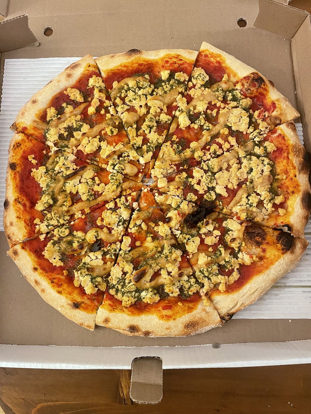 Serves meat, vegan options available. Small pizzeria offering a unique homemade tofu-based vegan cheese on all pizzas. Select when ordering., Any lacto-veg pizza can be made vehan. Open Mon 4:00pm-9:00pm, Tue 11:30am-10:00am, Wed-Sun 11:30am-10:00pm.