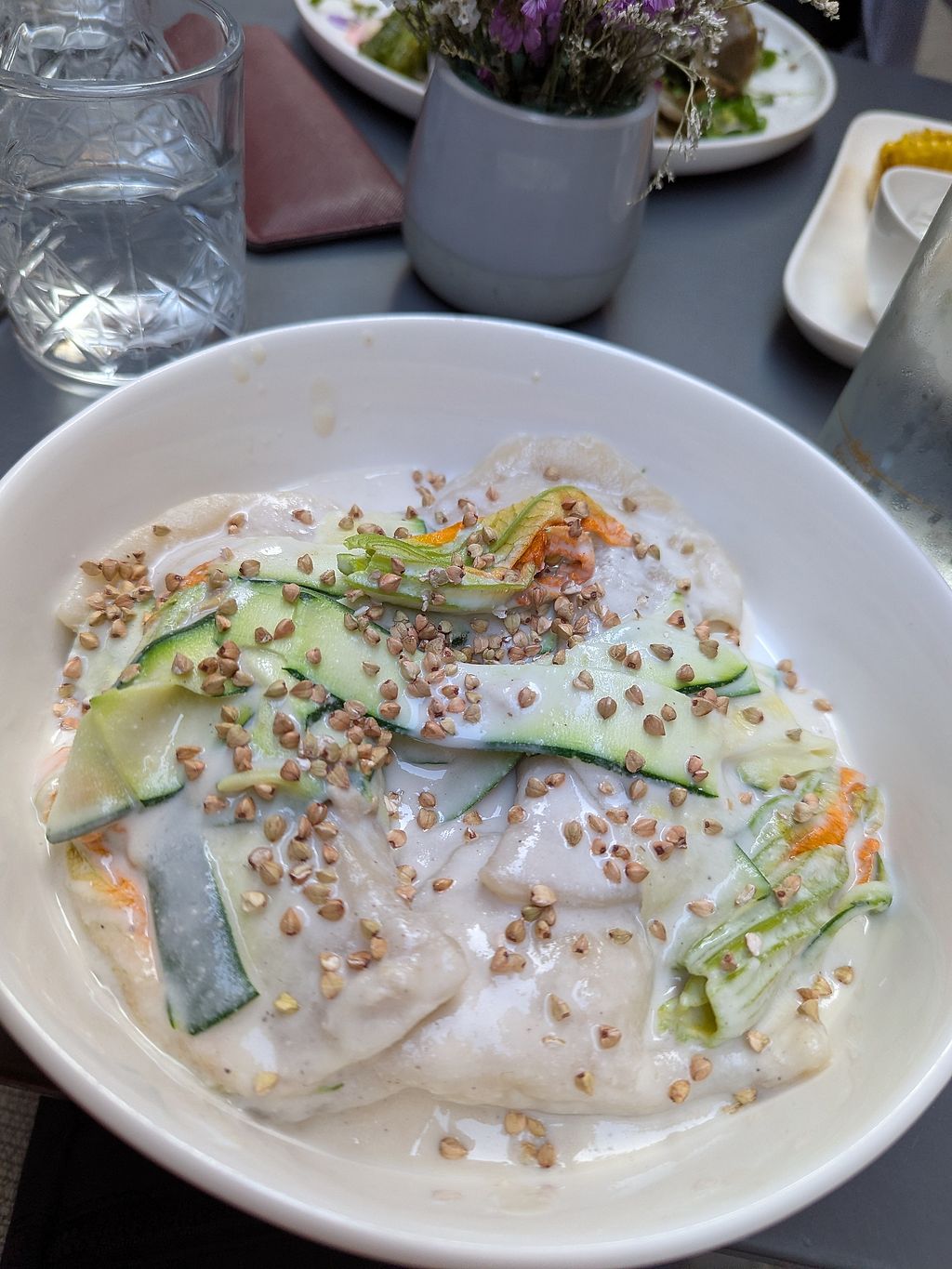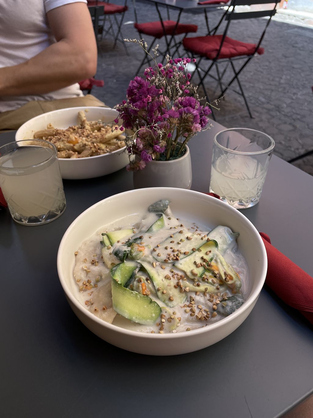 This location is truly beautiful and the inside was so chic and lovely. It made for a perfect pairing with the most delicious summer menu. The corn spread was delectable, the pesto was so creamy and each dish had such a unique flavor from the other. So thrilled that Bologna has such a fantastic place that is vegan - yay.