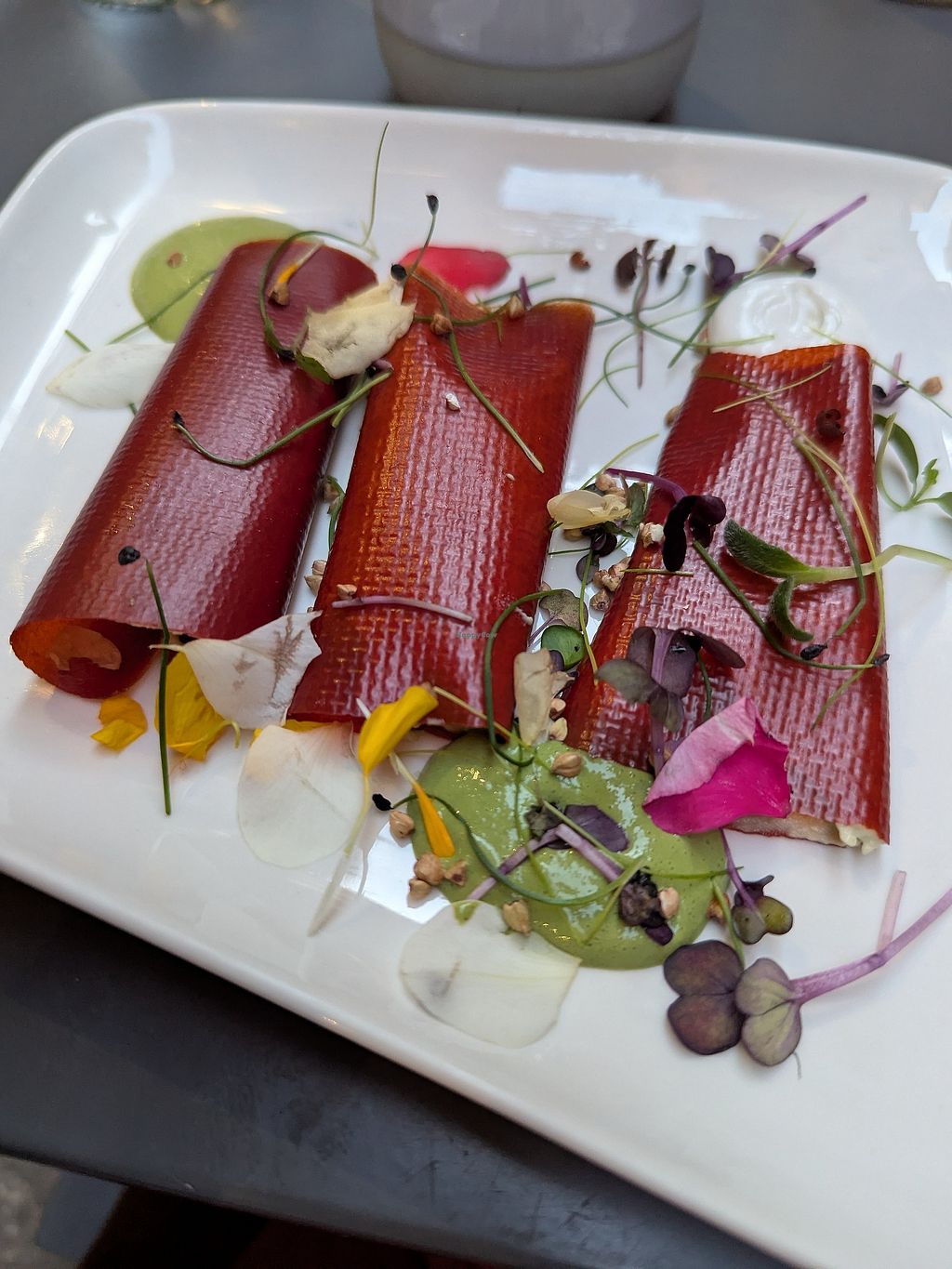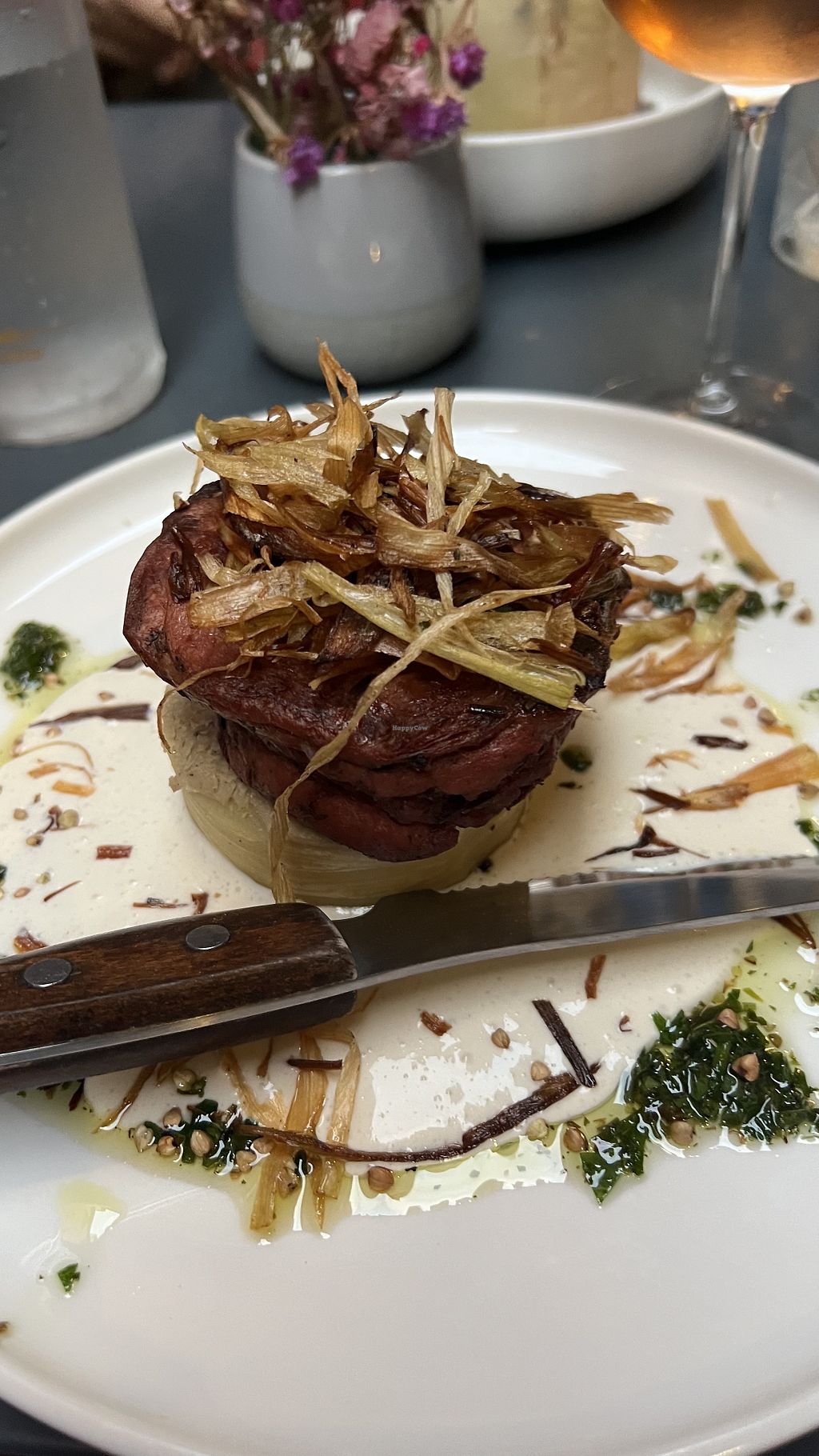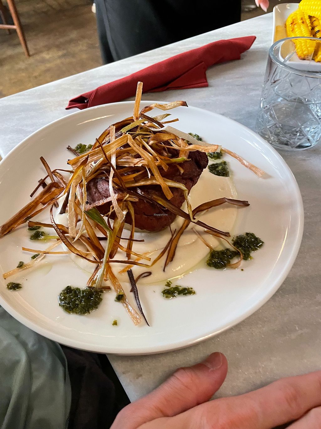 Make a reservation, this place is worth the planning. Everyone around us was getting the beyond burger, which looked fantastic, but we can get that anywhere where we live. Instead we ordered the “filet” which was so real that I had to stop to inspect to make sure it was plant based. So good. Service was efficient and professional. Cannot say enough good things about our dinner here.