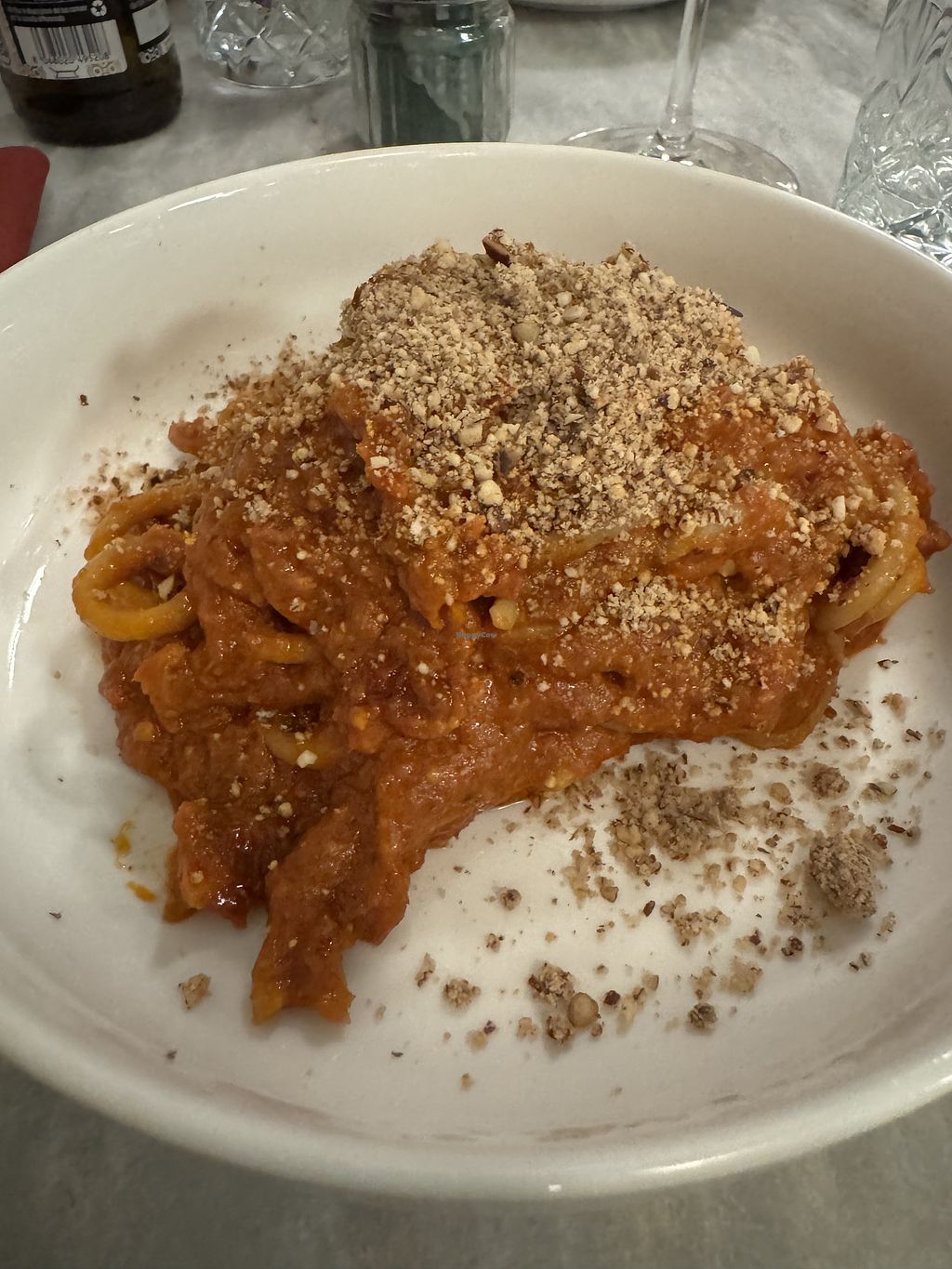 Friendly, cool but relaxed restaurant on quiet street 5 mins from Piazza Maggiore. Recommend booking to avoid disappointment- easy to do on website. Fantastic asparagus filled tortellini with fresh asparagus shavings. The other dishes being served looked great too. Lovely to find a vegan place obviously so popular in a city that loves its ragu and mortadella. Told food tour guide I'd been and he said 'ah -you went to the best.' I agree. Would go all the time if I lived in Bologna.