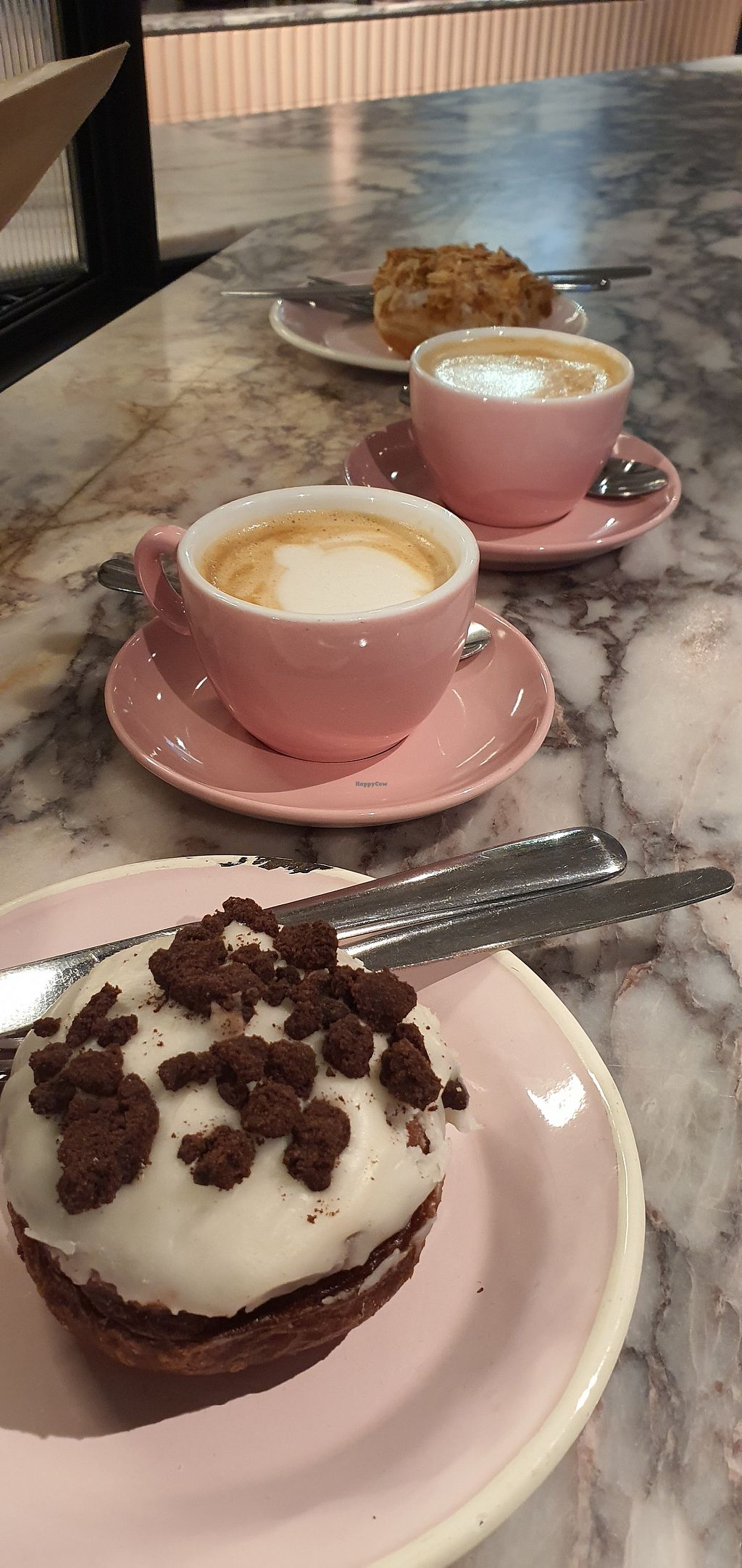 Lemon poppyseed doughnut, caramel hazelnut doughnut, oat milk latte