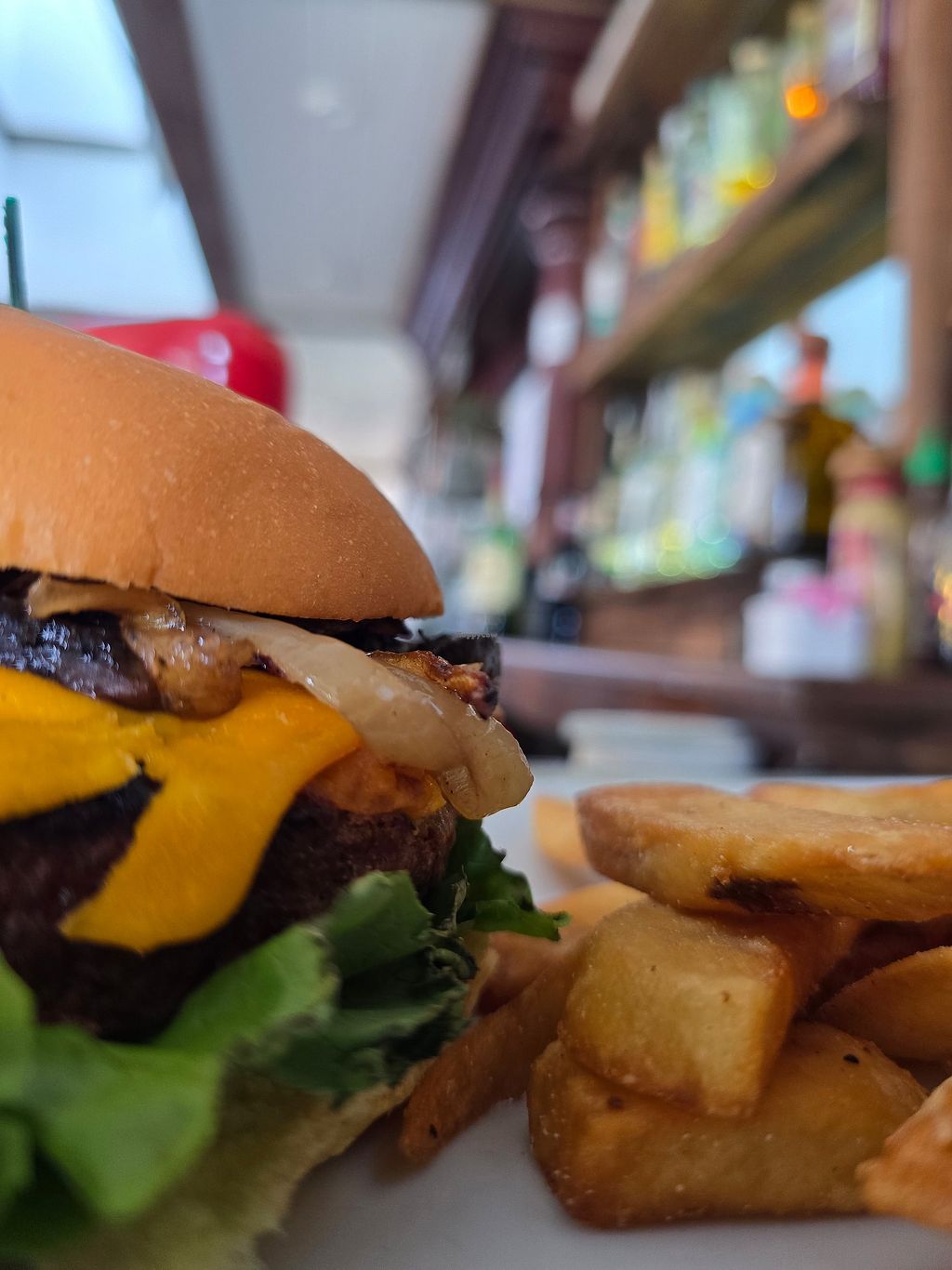 Pros: Dogs welcome, Beyond Burger and vegan cheese, fried mushrooms and onions