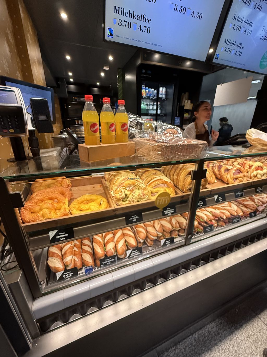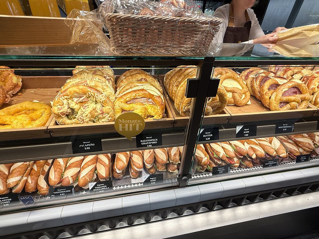Chain of pretzel bakeries with vegan options. There are several types of marked vegan pretzels with various seeds like sunflower, pumpkin, sesame, and poppy. The avocado chili sandwich, the planted chicken curry sandwich and the hot dog (when ordered with ketchup) are also vegan. Open Mon-Fri 5:00am-10:00pm, Sat 5:00am-7:00pm, Sun 7:00am-7:00pm.
