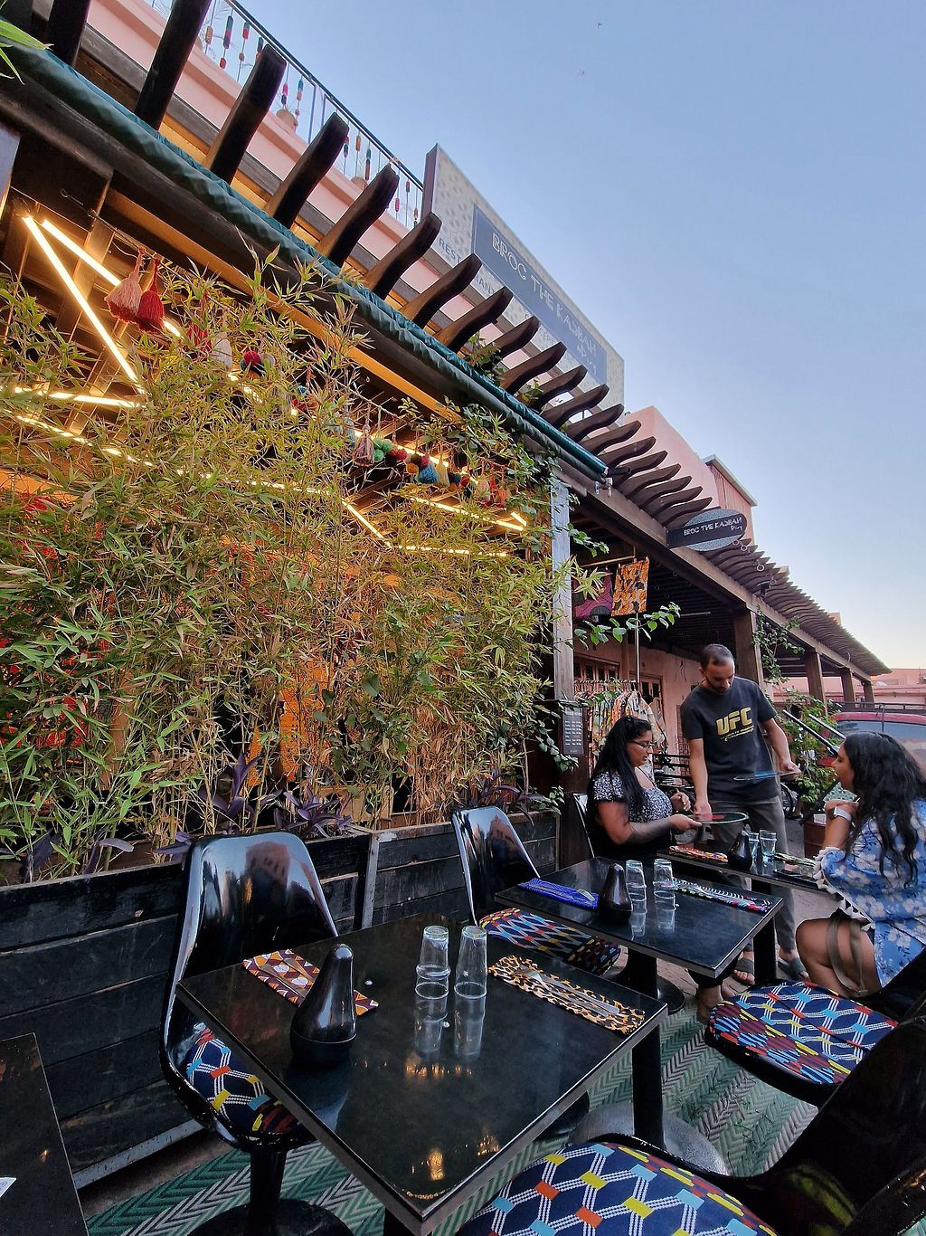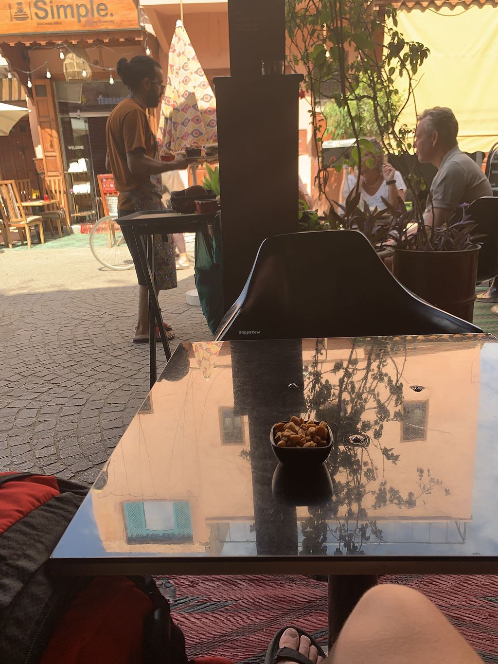 Just at the quieter end of the medina, outdoor seating to watch the world go by, really delicious vegan / veggie food and thirst quenching juices served enthusiastically by charming staff. I had the avocado salad & spicy humus which was refreshing and tasty, my partner had the Kasbah burger which was enormous as well as very toothsome. Part of a quirky ‘concept’ store with fun clothes and household items. Going back again tomorrow!