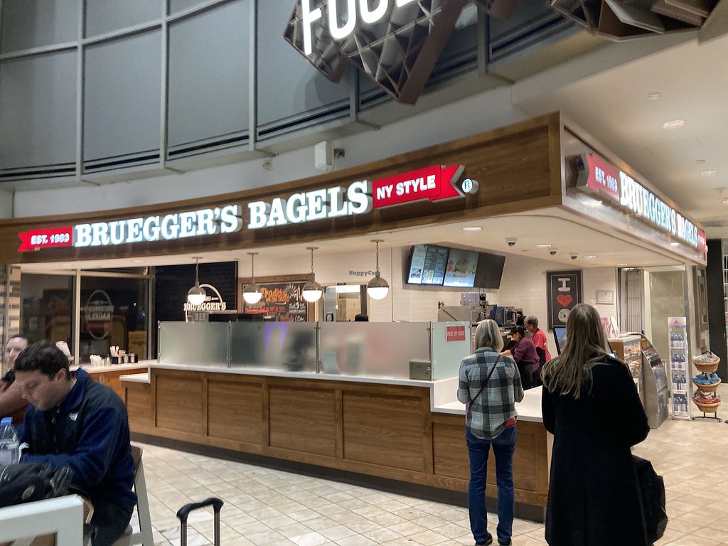 Serves meat, vegan options available. Between Airport Concourse C & A, across from the last tram stop, you will see this bagel shop. Will provide an "off-menu" choice for vegans - ask. Open Mon-Sun 6:00am-6:00pm.
