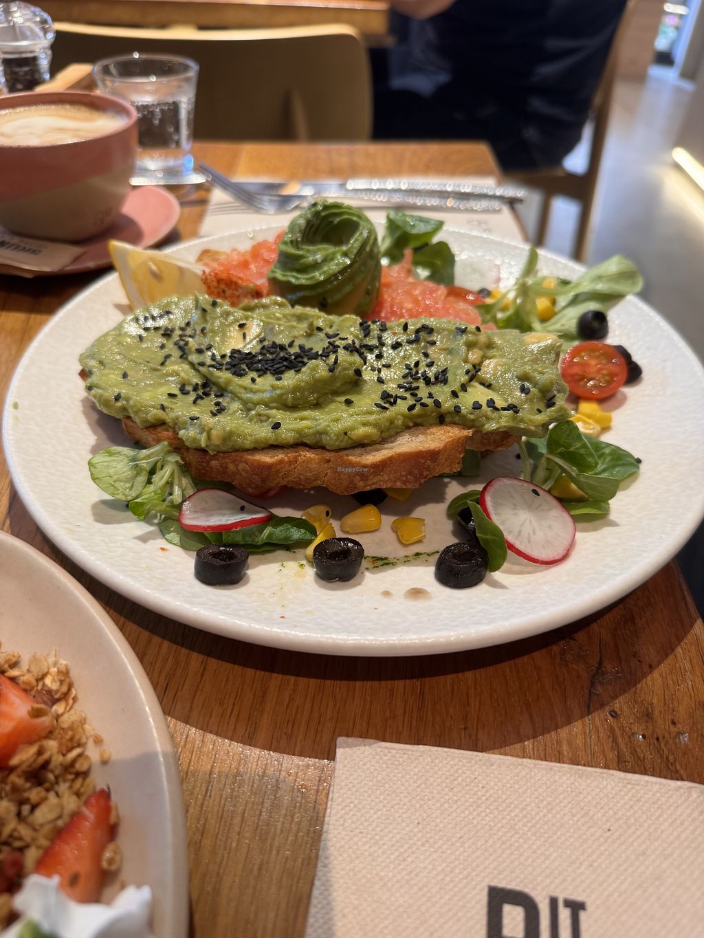 The berry pancakes and the avocada toast were very good. They also offer oatly milk for the coffee.