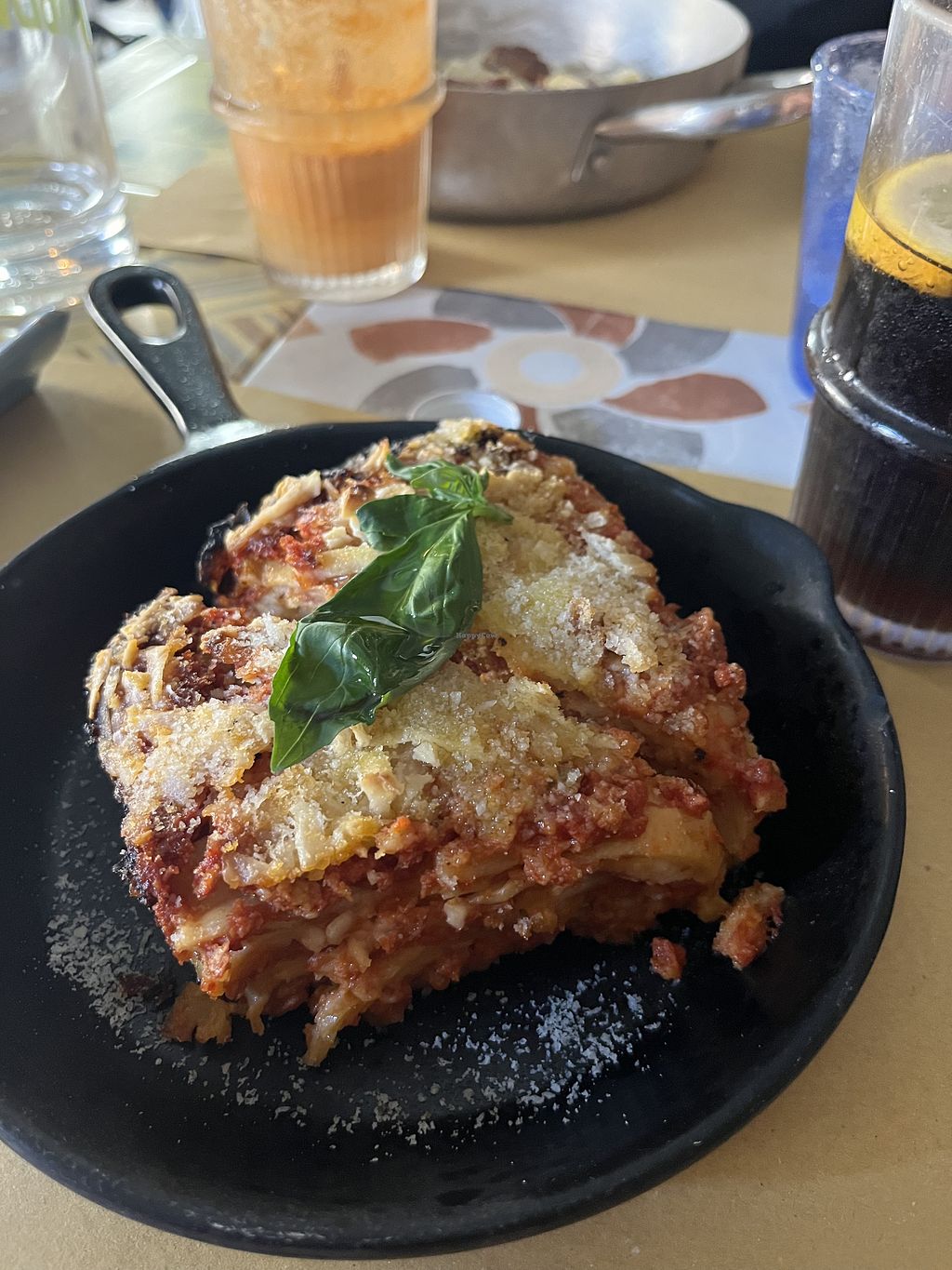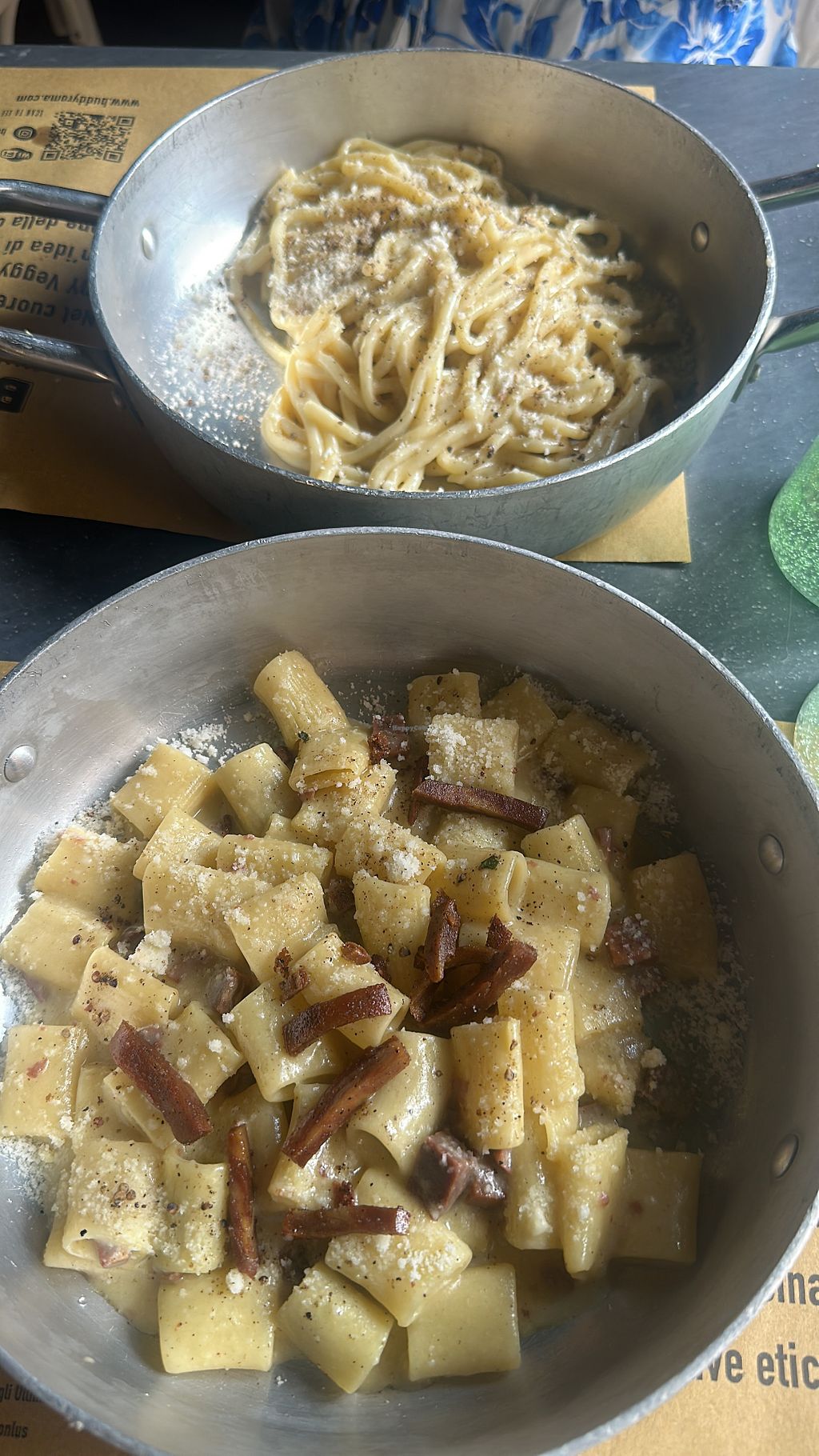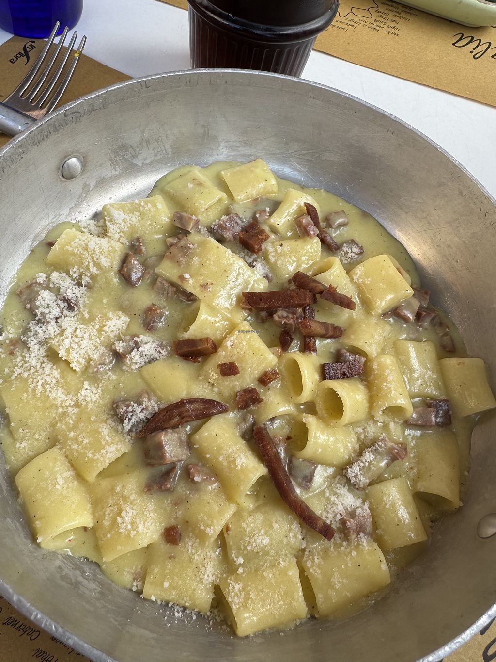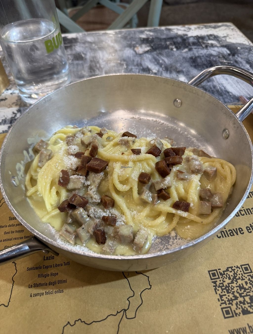 My boyfriend and I ate here twice while visiting Rome. Everything is 100% vegan and there are many dishes to choose from. We had the lasagna, Truffle pasta, bacon and egg pasta and a mushroom pinsa. All delicious.