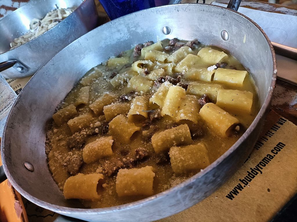 Se agradece encontrar un restaurante 100% vegano en el centro de Roma. Comimos supli de arroz negro riquísimo, pasta carbonara y otra con setas y trufa. Más rica la de trufa. La carbonara estaba un poco grasienta.