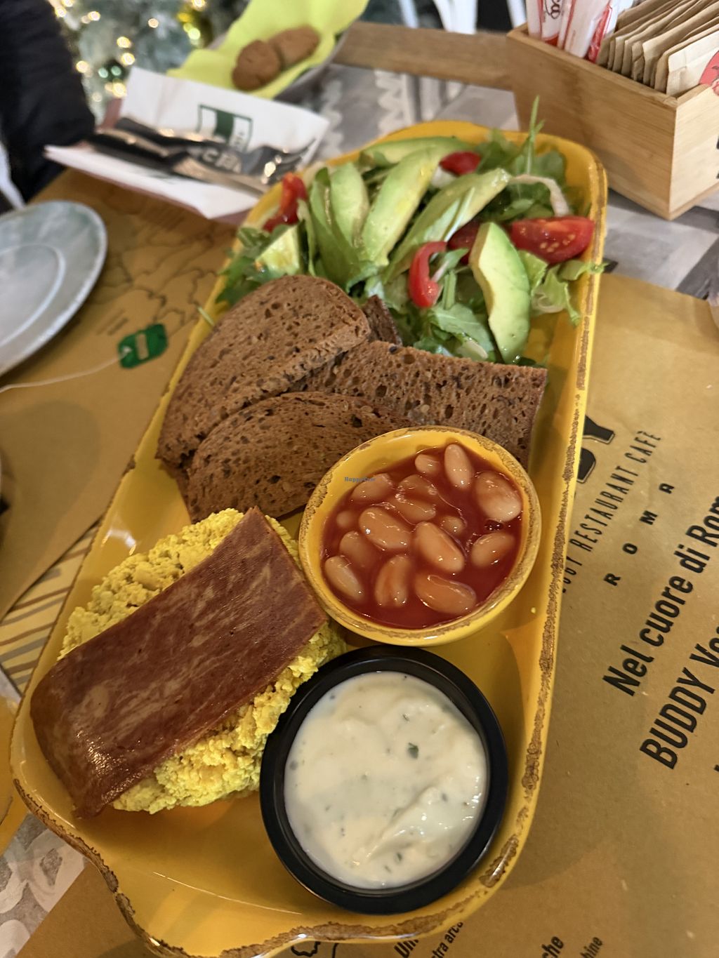 This is essentially a vegan tourist trap and it’s very overhyped on HappyCow. I found the food and drinks very underwhelming. The vegan breakfast was not my favorite and it was very expensive at 16€ for this dish. The tofu scramble seemed like it was made with oil and turmeric only. The beans were not good at all. There was brown lettuce mixed in the salad and the dressing was too lemony, but the slices of avocado were fine. The oat cappuccino was my least favorite in Rome, the flavor was bad and it didn’t even taste like coffee (and it was 4.50€, which was offensive). Worst yet, they didn’t bring this drink until we were paying/leaving, so we had to take it in a takeaway-cup despite telling them we didn’t want it anymore since it was meant to be consumed with our breakfast. Nevertheless, when they gave us the drink it was already cold.