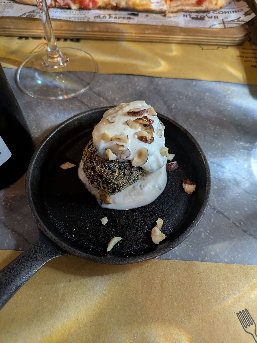 We had a great vegan meal including fried battered olives and the best tirimisu we've had on our trip to Italy so far.