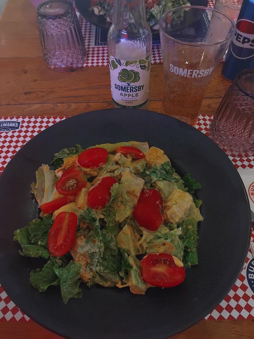 Burgers are huge and tasty and the fries crispy with an awesome bbq sauce to dip in. They have a vegetarian cake that they would have offered to us after the meal if we weren't vegan, instead we got pineapple and a tequila shot each 😂