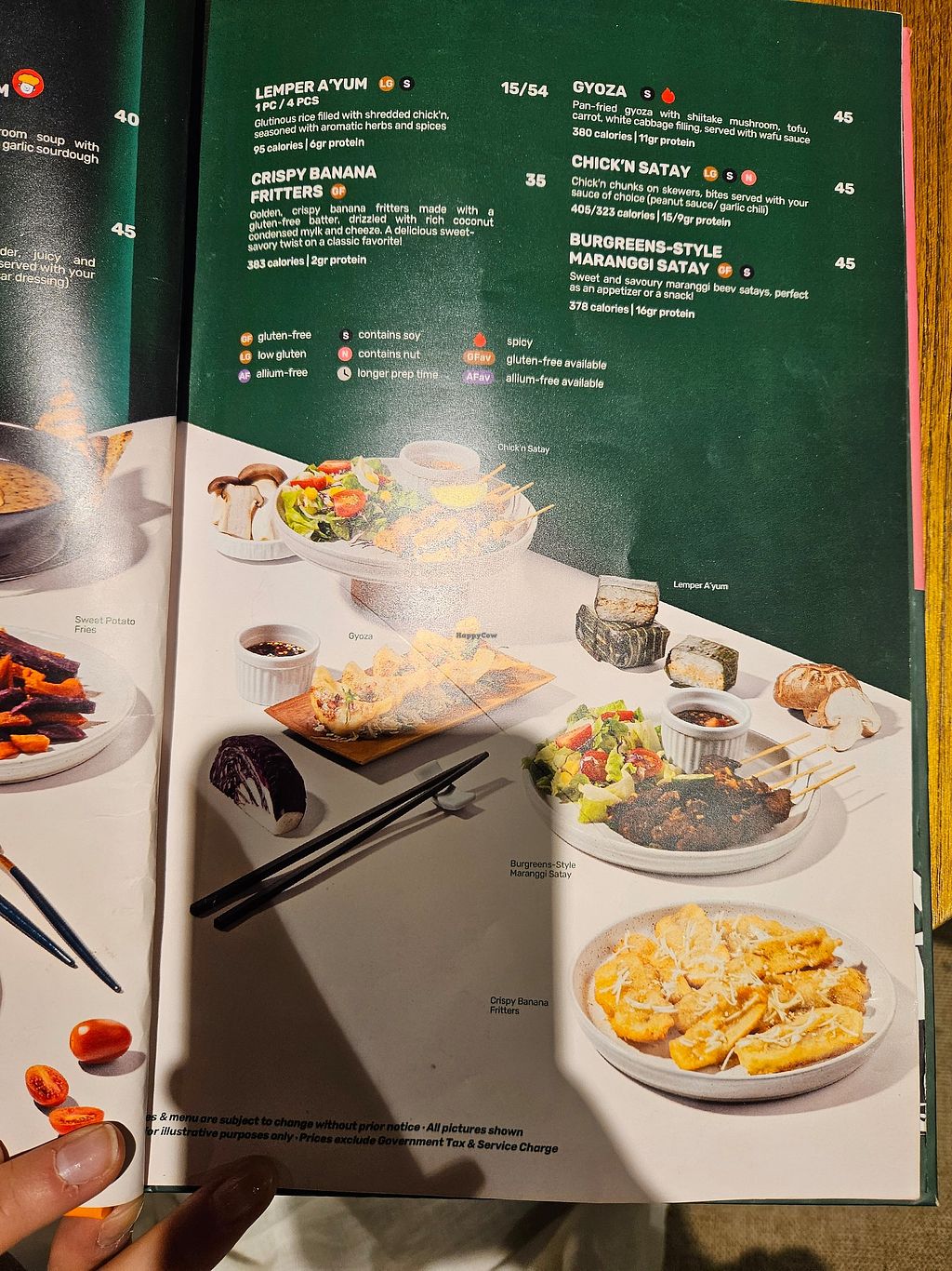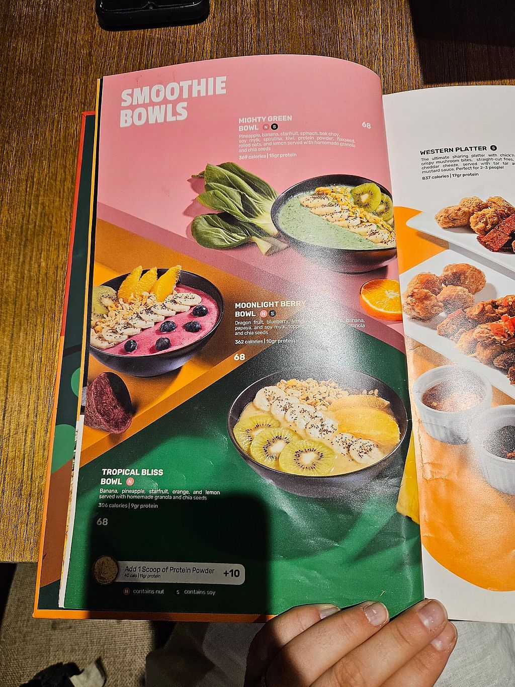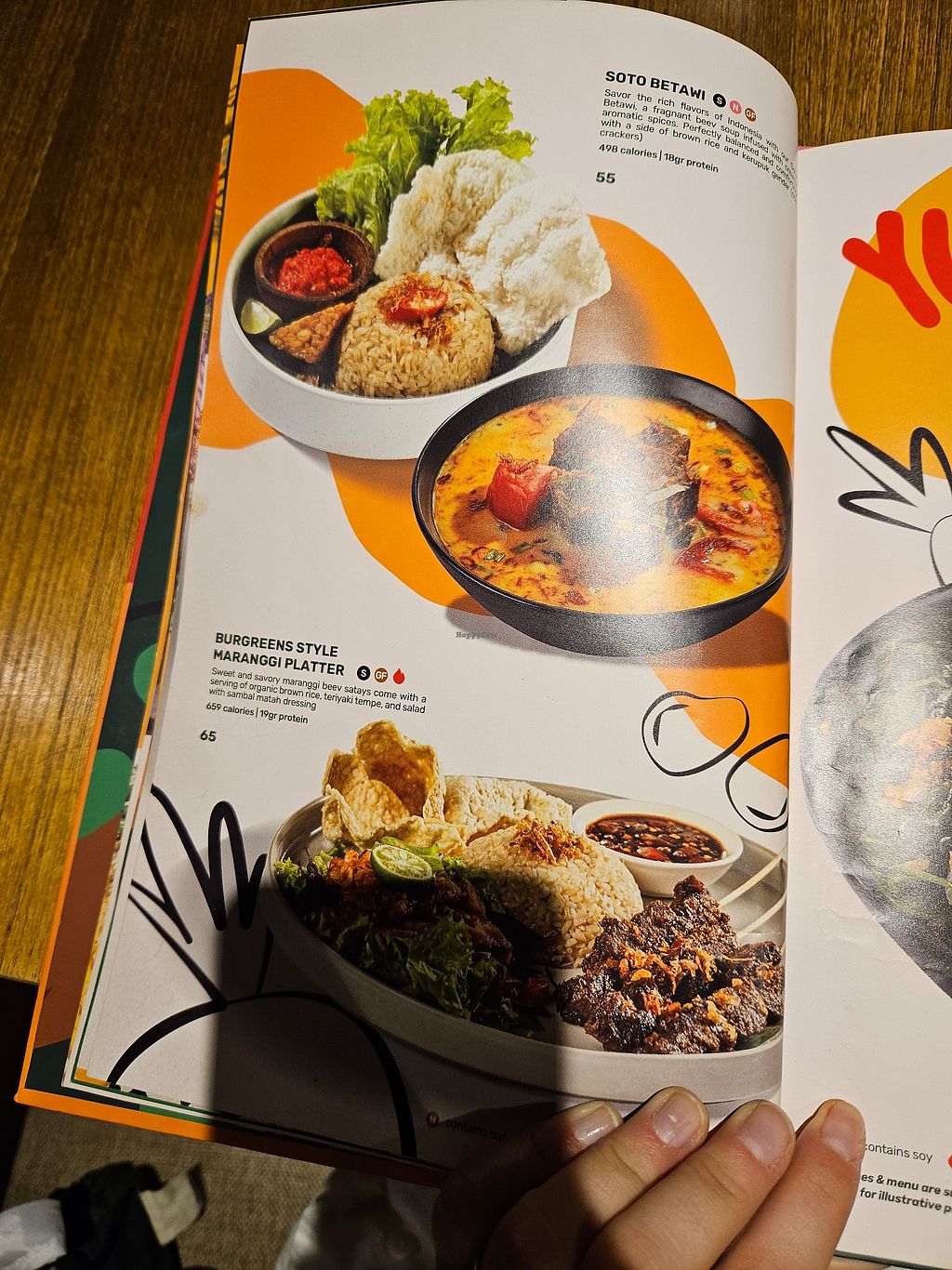 We visited Burgreens twice. We tried plenty of drinks and food as Coconut water, Brown Sugar MYLK TEA Boba (medium sweet), hot Flu fighter very strong and Super Immune Booster, Strawberry Kenary Nut Cheesecake (little sweet), Mighty Green Bowl not sweet but very frozen and Soto indonesian cuisine. The meal really looks like on the pictures, exactly. Nice place tasty options. I really recommended.
