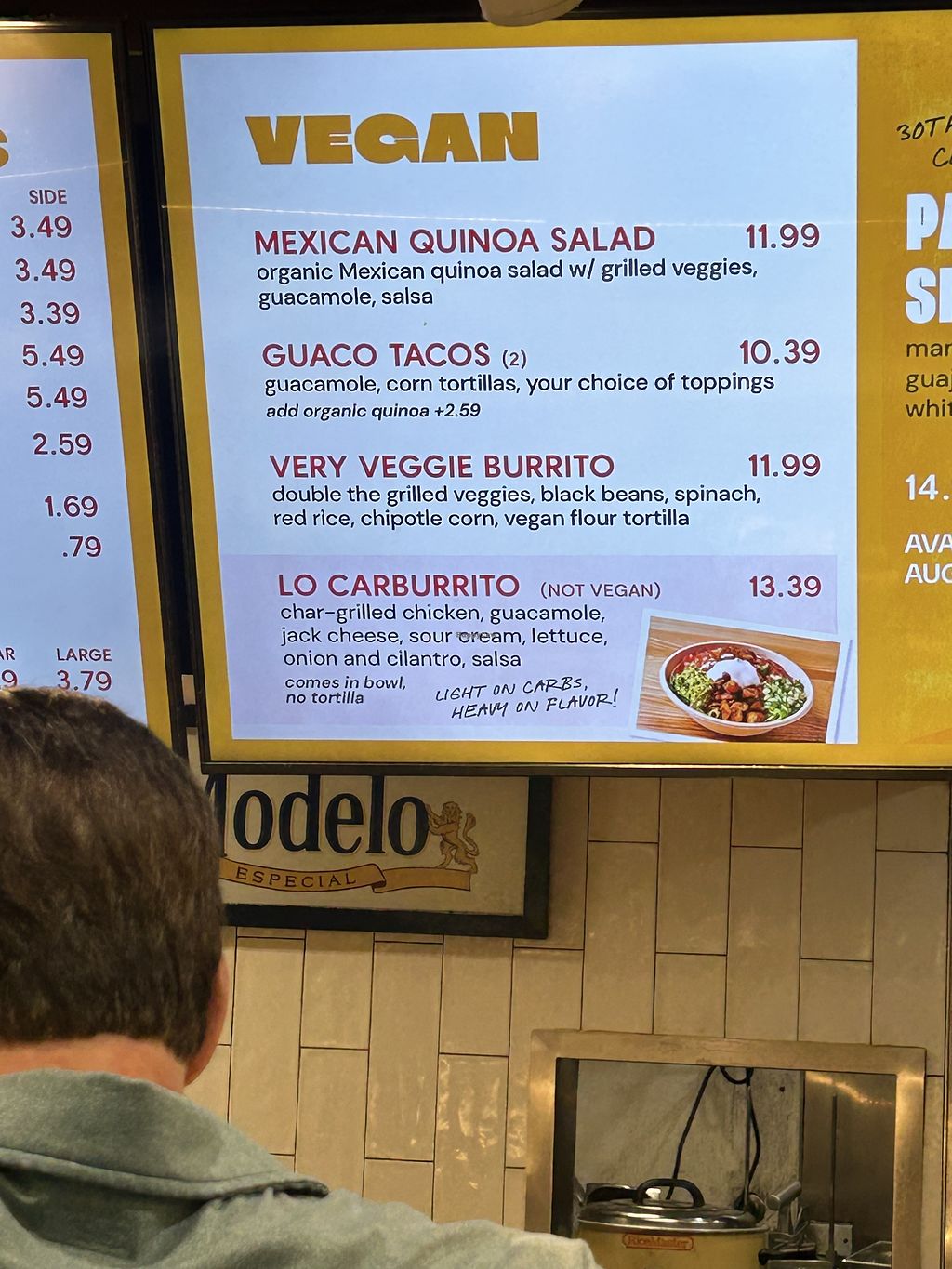 Had a very veggie burrito and the chips and Guac. Burrito was fine. It was fast. It had beans as protein. I could eat at the airport. All fine. The guacamole was about the worst I’ve ever had - super sharp oniony overpowered the avocado. Maybe an off night? Chips a bit on the dark side which I liked.