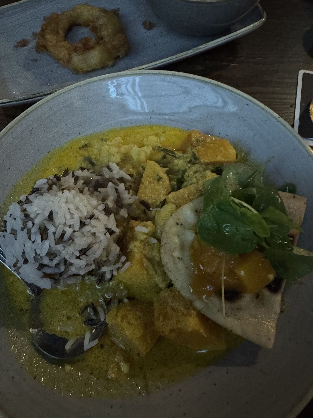 The Curry was ok but lacking flavour a bit. The food is very fresh and hot which is good. I also had the onion rings which were very good. There is a vegan starter which sounds good, I will try that another time.