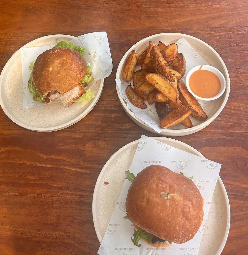 Serves meat, vegan options available. Local cafe and general store, est. since 1947. Menu includes smoothie bowls, burgers, coffee, salads. Has vegan options including waffles. Added meat to the menu November 2023. Open Mon-Sun 6:30am-2:30pm.
