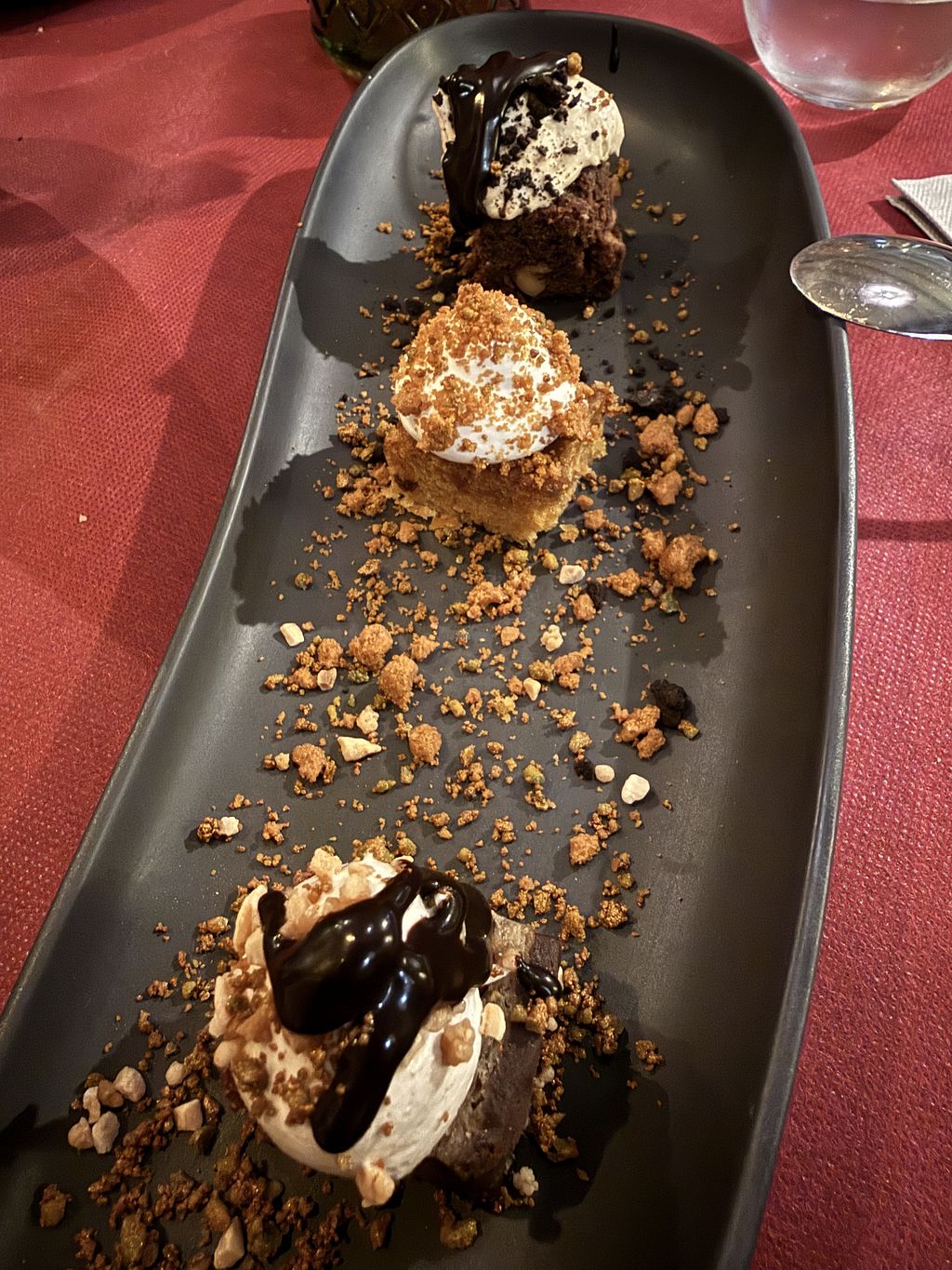 Seguí el orden que proponían —¡quién soy yo para contradecirles!—: los primeros eran pakora de espinacas con chutney de mango, alcachofa a la plancha con escabeche de cerveza y piñones, ravioli crudo de remolacha con queso de hierbas (salteado de nueces y alcaparras) y finalmente, bao de heura en adobo con chitake y mayonesa sriracha. Aconsejado por el personal, de principal comí una fantástica hamburguesa de lentejas con patatas al horno incluído todo en el menú. Lo último fue, como no podía ser de otra manera, un popurrí de tres pequeños postres muy a la altura del resto de platos.