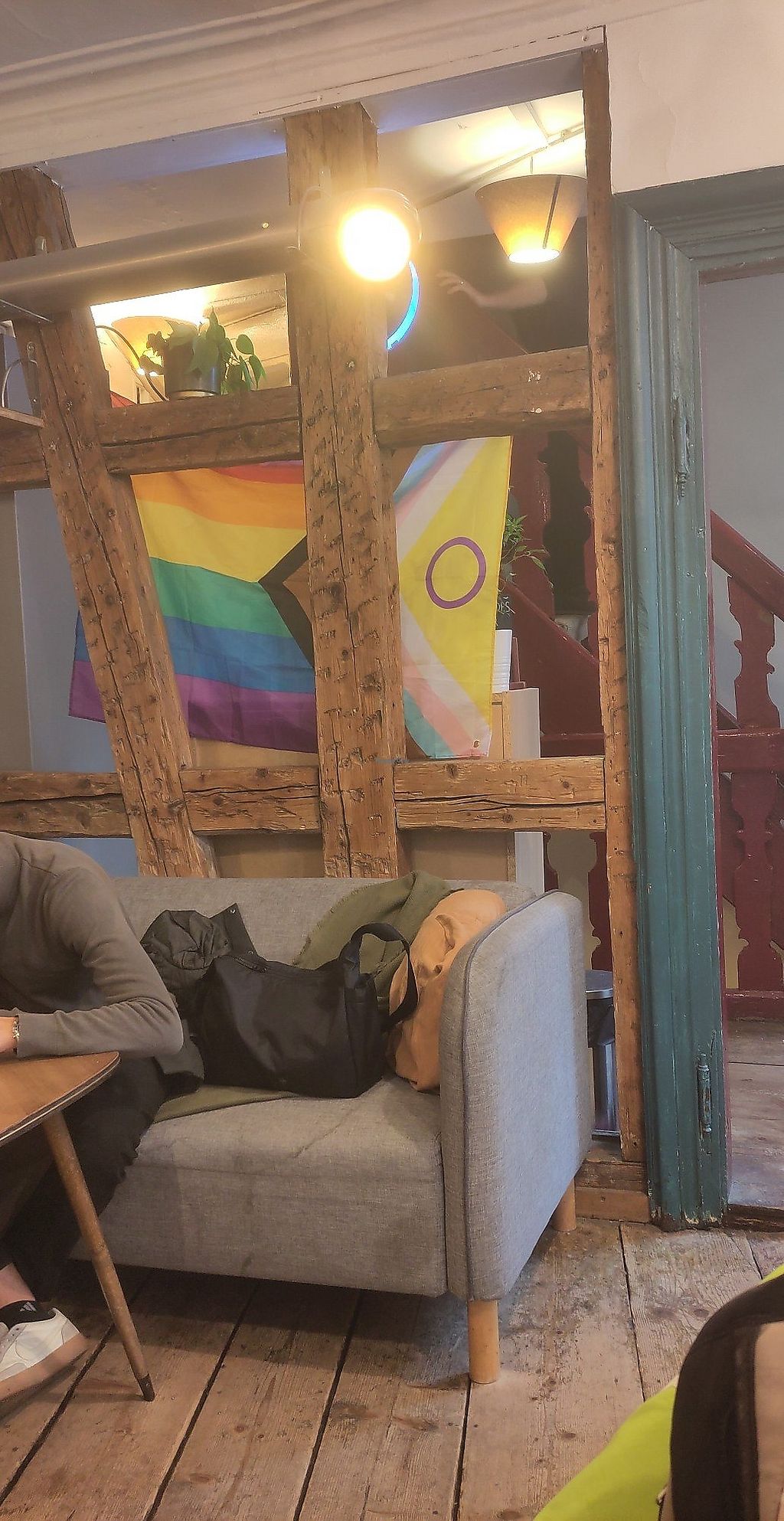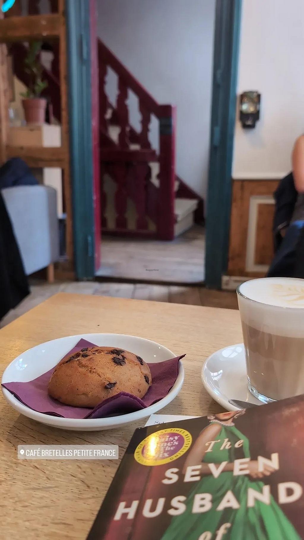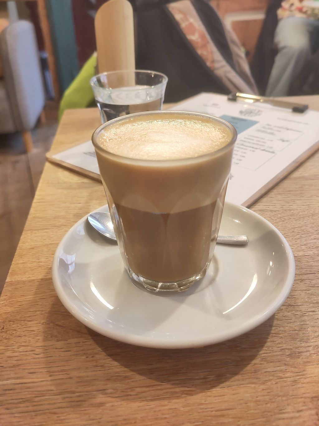 Ich hatte einen veganen Cookie (sie hatten nichts anderes da) und einen Latte Hafermilch. Die erste Etage ist sehr gemütlich mit Sitzplätzen, fühlt sich fast an wie ein Wohnzimmer.
