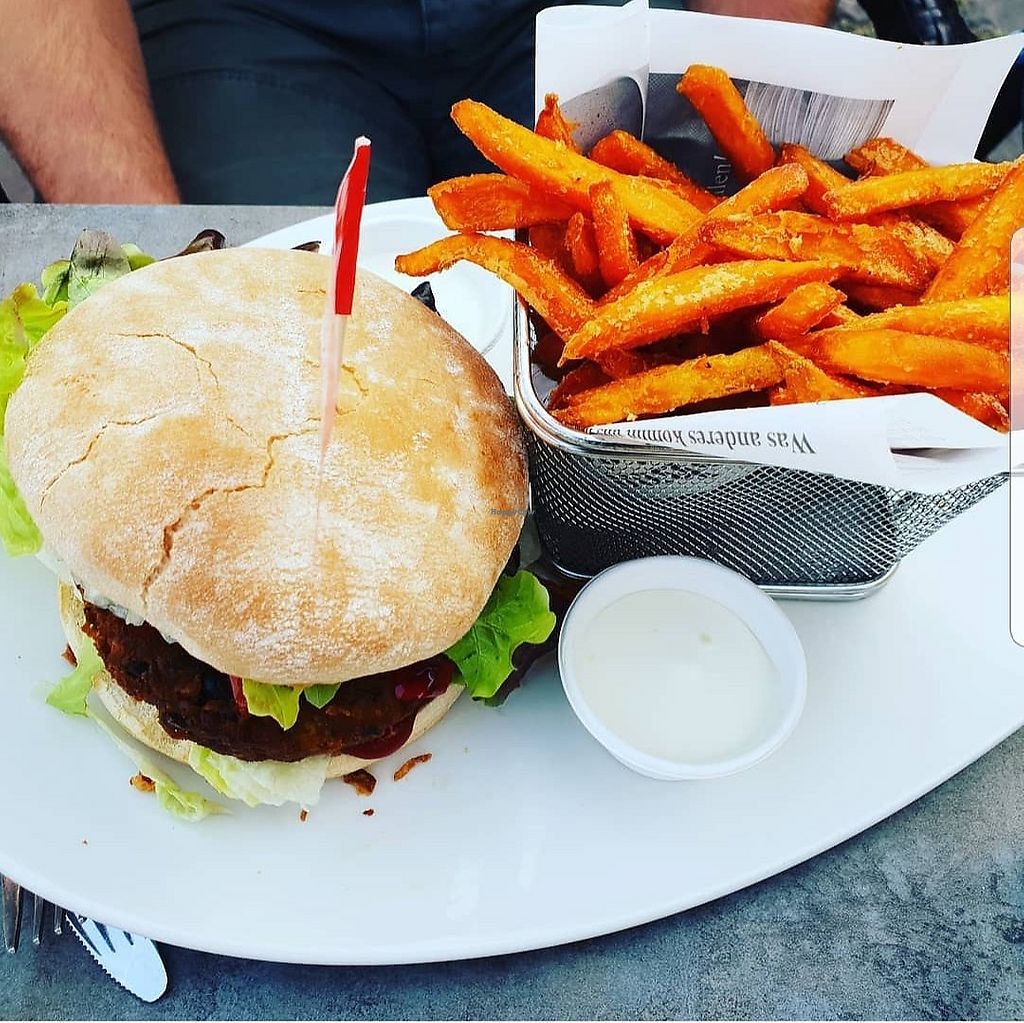 Für einen Snack zum Mittagessen sehr zu empfehlen. Es gibt Pommes, Süßkartoffel-Pommes, Burger, Schnitzel und Nuggets. Dazu gibt es Dips wie vegane Mayo oder Erdnusssauce.