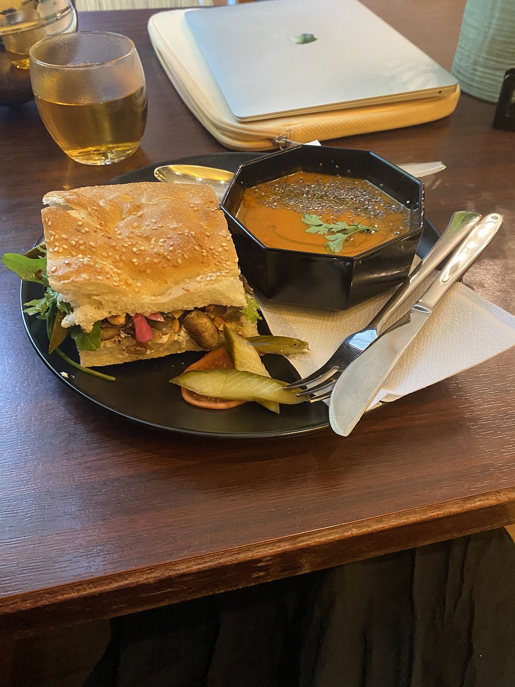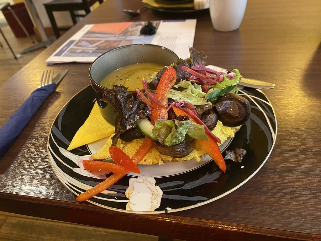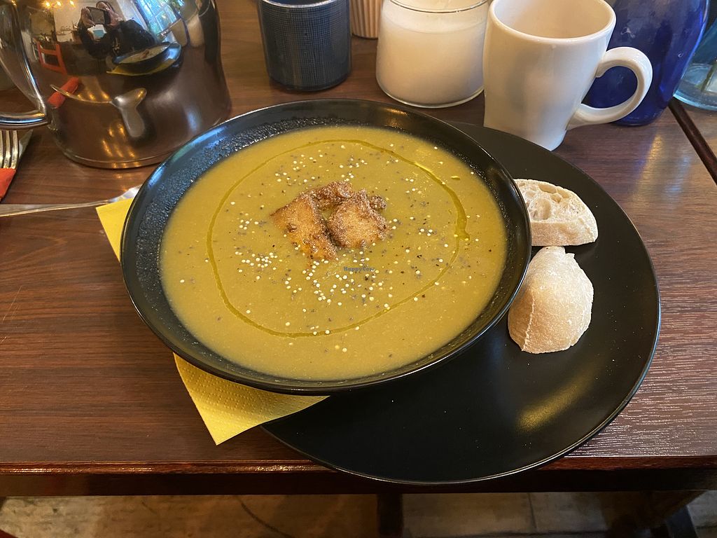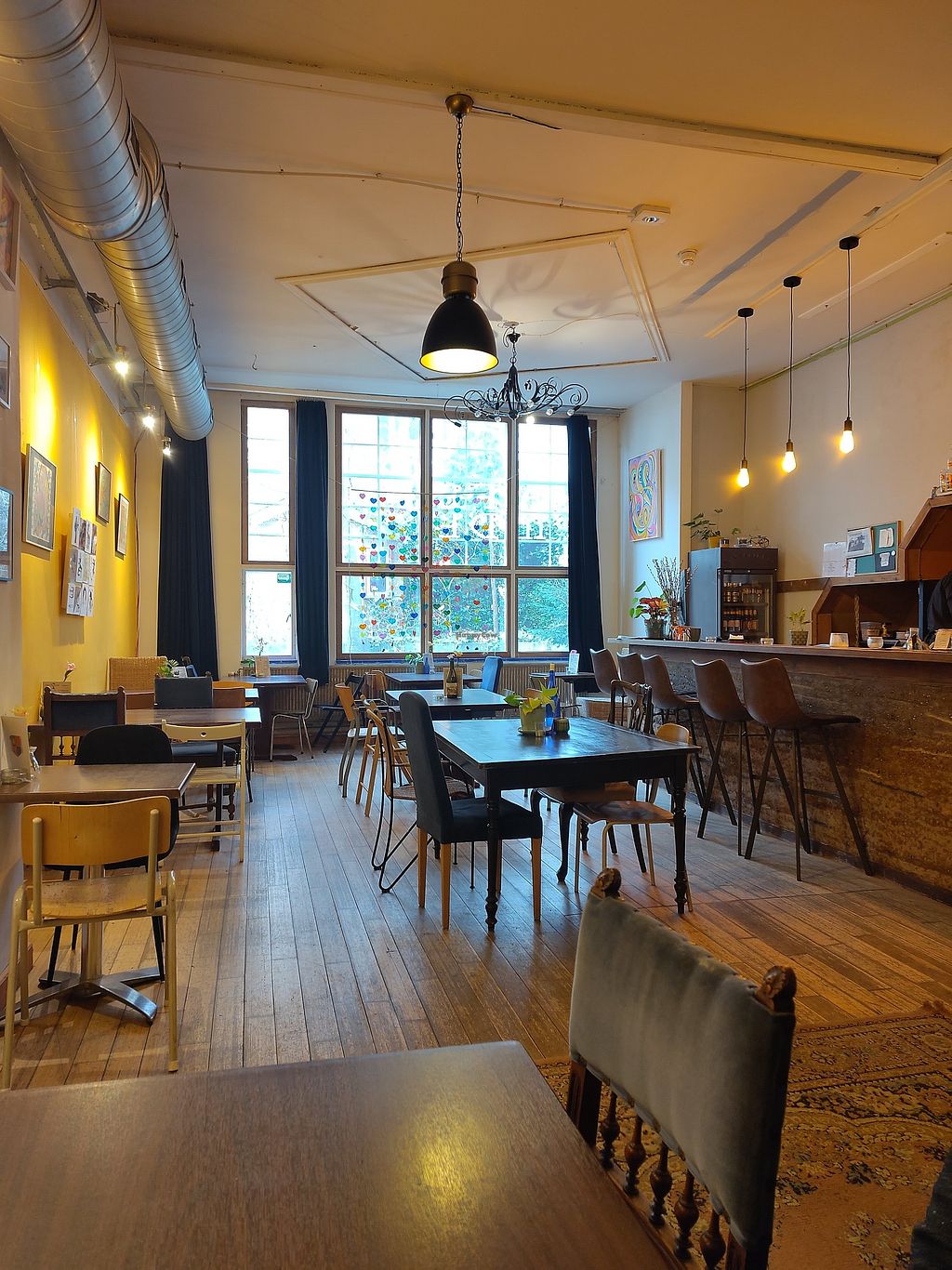 Fully vegan café operated as a non-profit, serving breakfast, lunch, and drinks. The menu changes regularly and features a variety of cuisines. Items include tofu scramble, and a rotating sandwich, soup, and salad based on available ingredients. Open Tue 12:00-17:00, Thu 12:00-17:00, Fri 12:00-20:00. Closed Sun, Mon, & Wed.