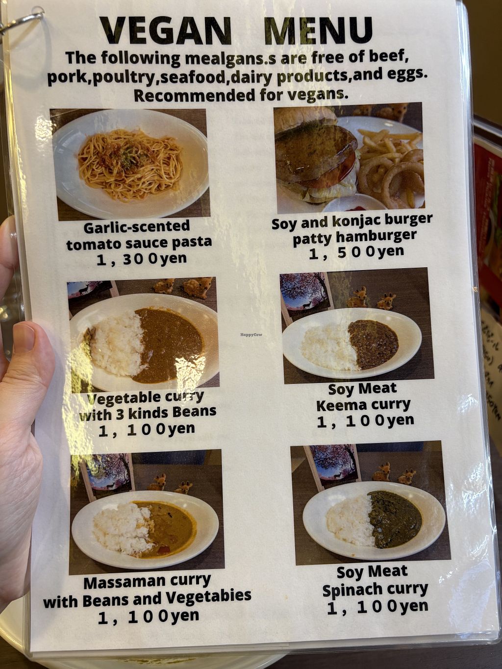Serves meat, vegan options available. Japanese-style Western cuisine served in a Japanese-style room (take shoes off). Vegan options include curry rice, soy and konnyaku burger, and garlic tomato pasta. Address in Japanese - 東向南町5 みやげ横丁内 2階. Open Mon-Sun 11:00am-5:30pm.