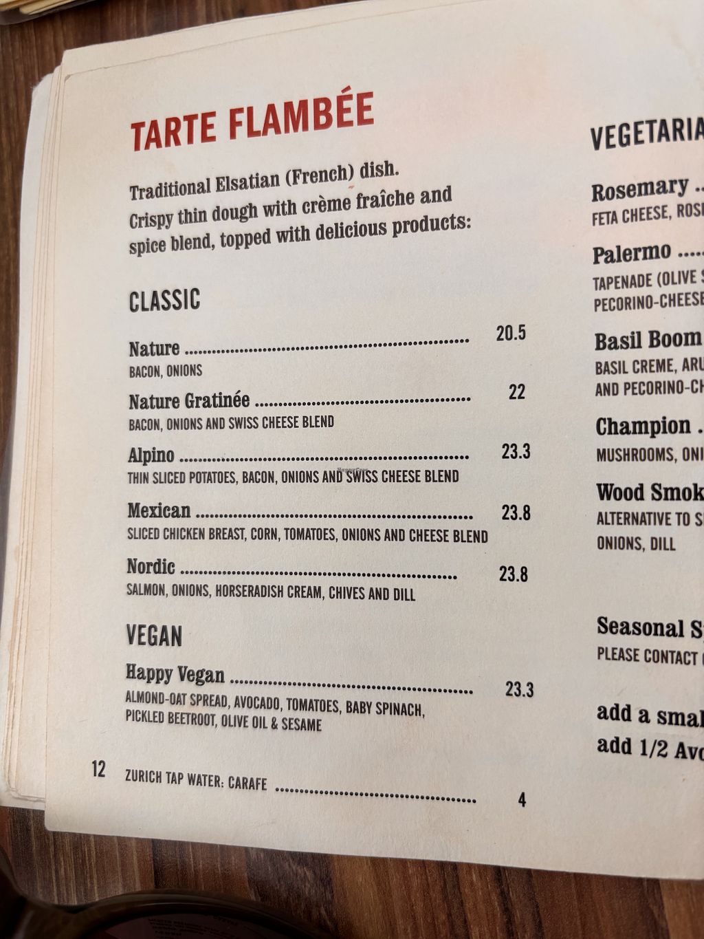 Read moreI had a Tarte Flambée and it was fantastic (22,50 CHF ~ 22,50 euro)