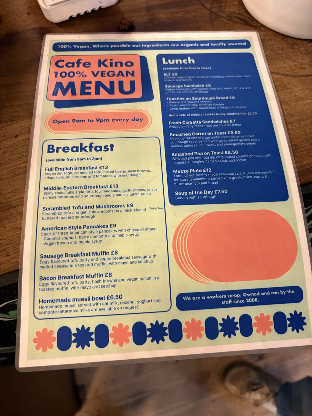 Cafe Kino is a great community space and independent business that has the aim to source locally wherever possible. The menu also looked to be fully vegan rather than veggie from what I could see. It's a little expensive, but considering their ethics, I decided it was worth spending a bit more.