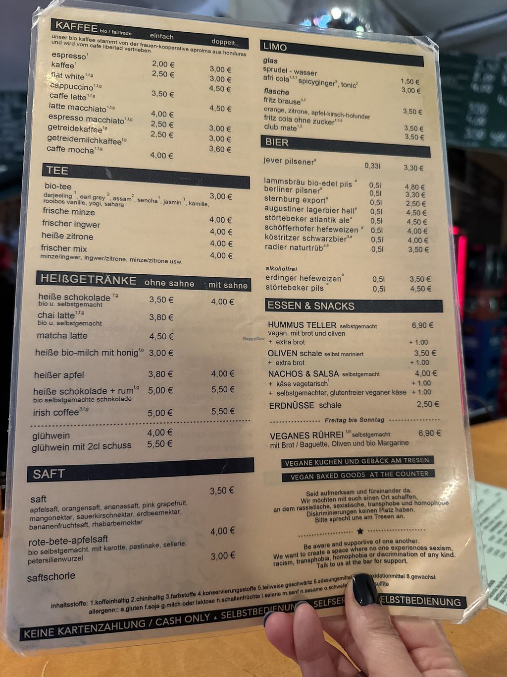 Read moreIt is run by a collective and is a leftist political meeting spot. The menu even includes "right-wing" discrimination as one of the types of discriminations they don't want in the cafe - right next to racist, sexist and homophobic discrimination.