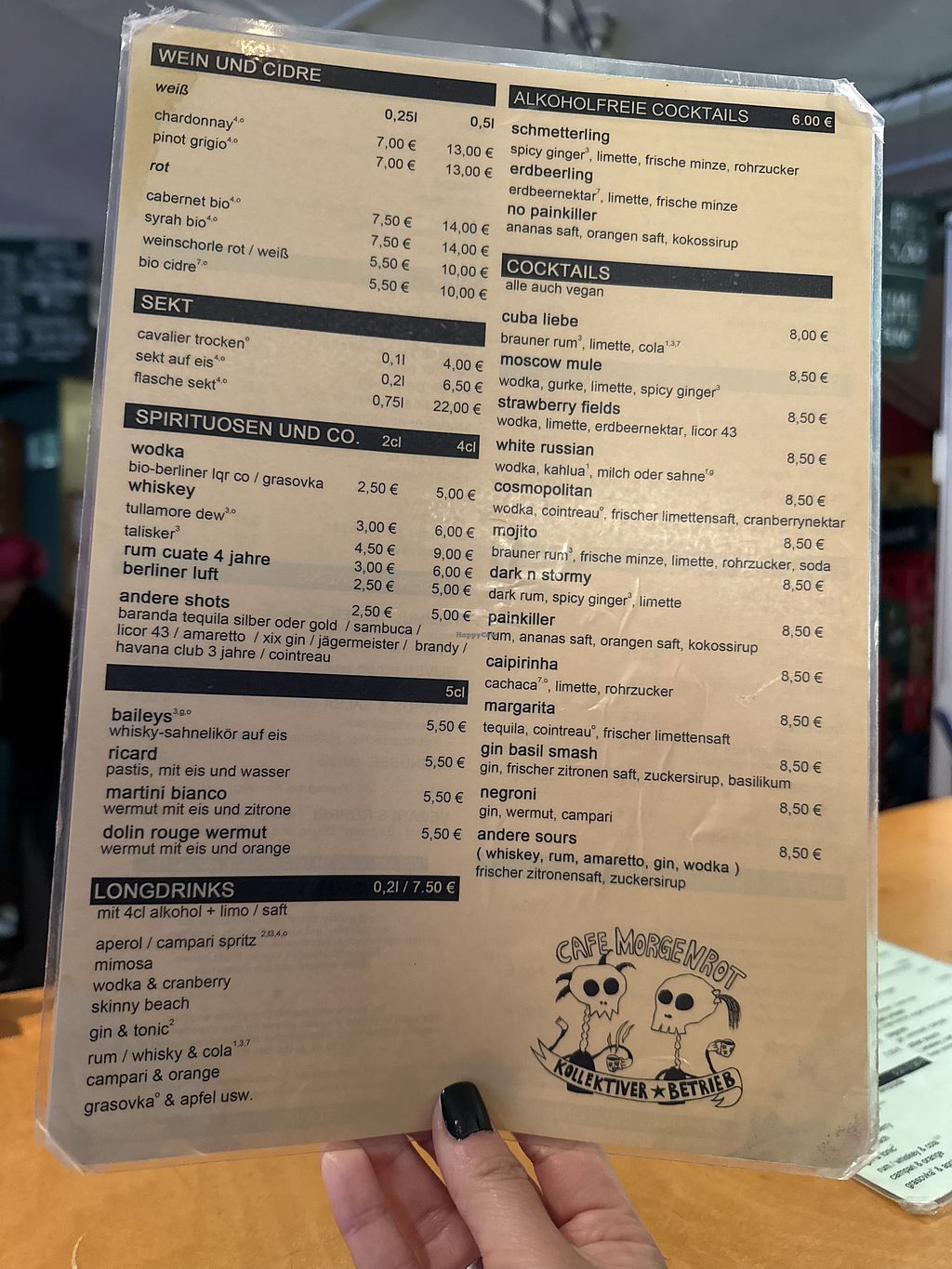 Regarding the beverages, there is a choice of various milks (organic cow milk or vegan: soy, oat, almond) for coffee latte, matcha latte and chai latte etc. ☕️🍵 Besides, there are teas, juices, soft drinks as well as alcoholic drinks since this location turns into a bar (German "Kneipe") at night. 🍻🍷🍹