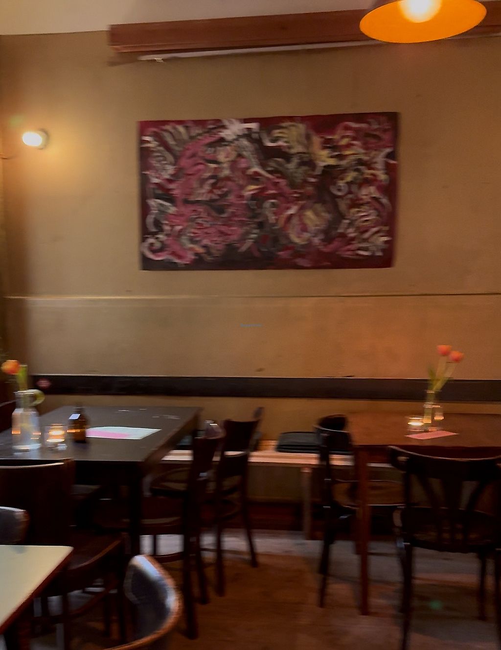 Read moreSelf-service, generally chilled, sometimes a bit slow, many colorful costumers, only vegan and vegetarian food and drinks. There are dark, shadowy areas as well as seats next to the large windows.