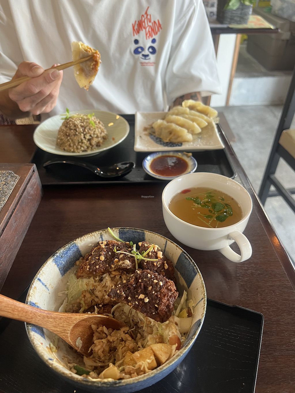 Found the food incredibly average unfortunately. We had the soy meat cutlet rice bowl, fried rice, and grilled dumplings. They do do a cool medicinal soup though which we also got.