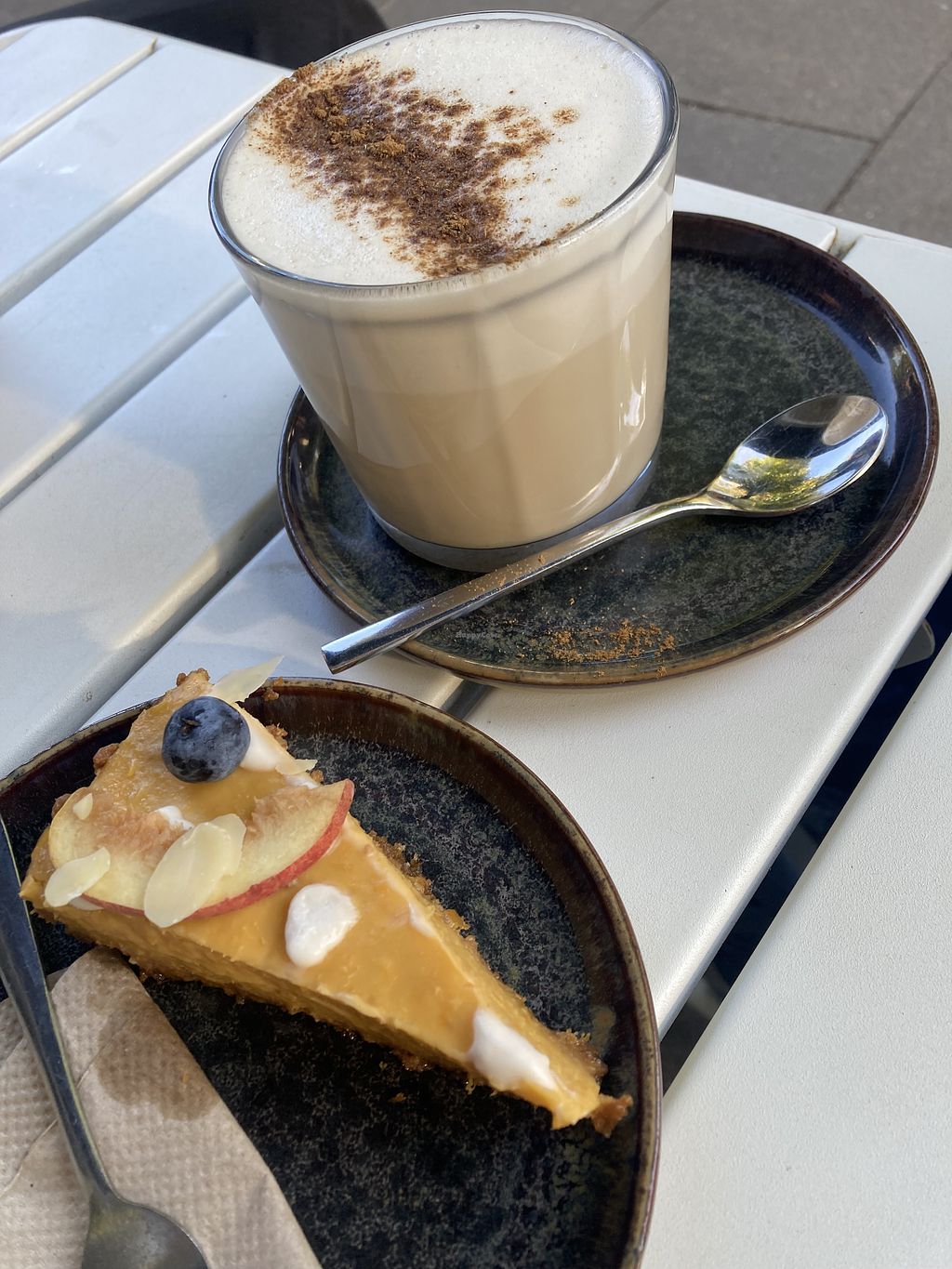 Chai Latte und eine Mandeltarte mit Aprikosen - solide, aber nicht außergewöhnlich