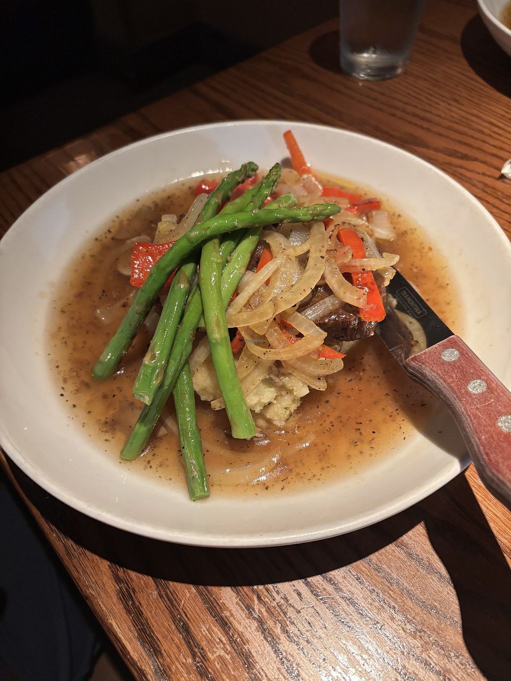 Loved the special of plant-based steak (similar to prime rib, and with a great texture) with mashed potatoes and veggies, artfully presented. The fried avocado tacos were pretty good - could have done without the cheese, which was a little strange in combo with chipotle sauce. Service was attentive and enjoyed the atmosphere. Overall very enjoyable!