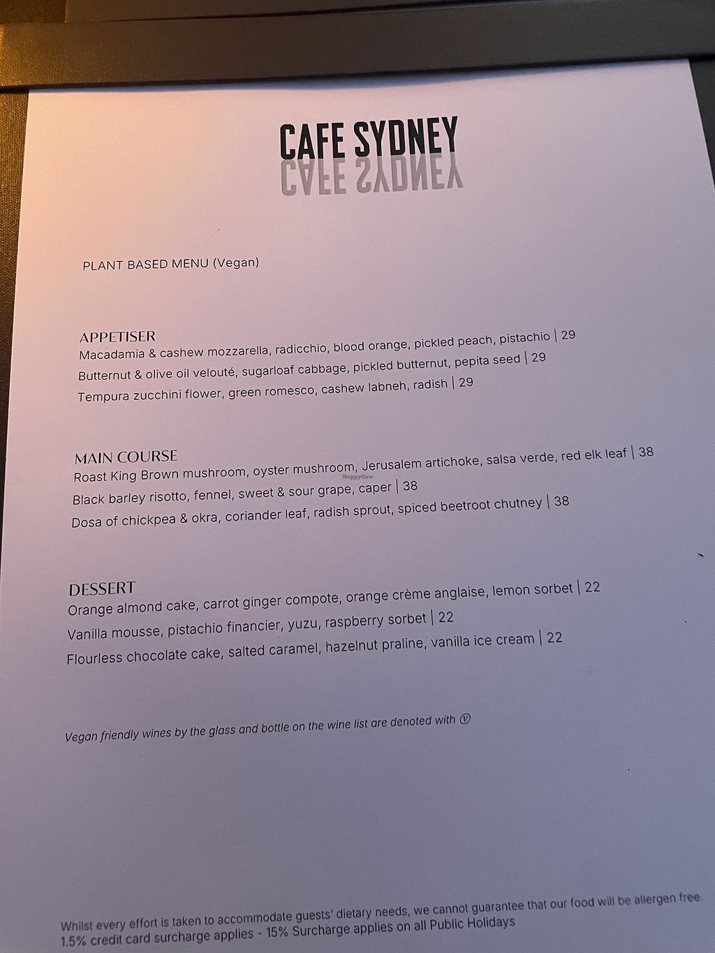 I went to Cafe Sydney for my wedding anniversary. The view is nice, the service is good. Small amount of vegan options but everything was tasty. Definitely not the best meal I've had and I would definitely choose some other fancy restaurants in syndey over this one. Nice for once off experience but wouldn't go again. You pay for the view and service.