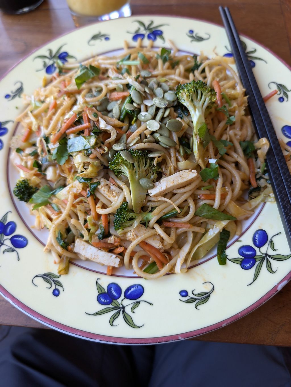 Great hand made noodles, broccoli, carrots, left greens, tofu, celery, scallions, pumpkin seeds, mildly spiced.