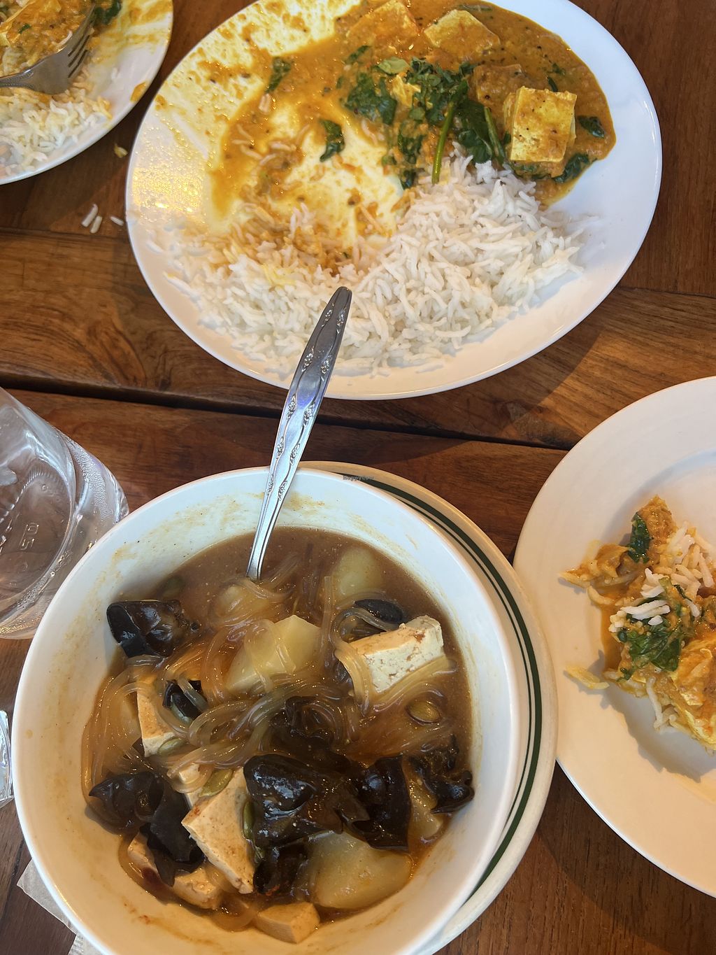 Tasty vegan eats! Momos, curries potatoes, and hand pulled noodles. What’s not to love😄