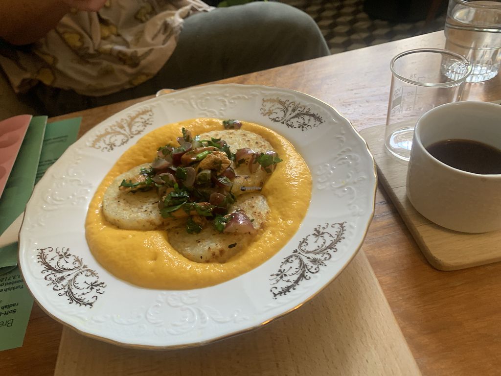 Serves meat, vegan options available. Cafe with mostly vegetarian choices, of which some can be made vegan (clearly labeled) and include porridge, corn-zucchini fritters or others. The offer changes every couple of months. At times the menu is fully vegetarian with vegan options. Open Mon-Fri 08:00-22:00, Sat 10:00-22:00, Sun 10:00-20:00.