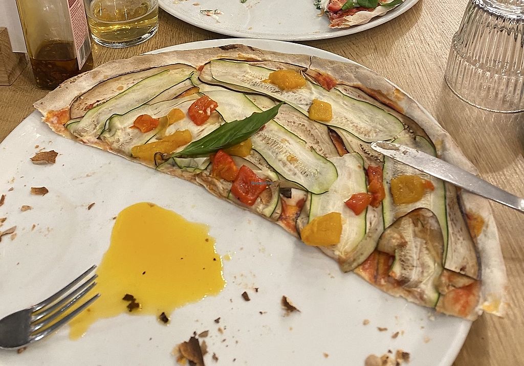 Serves meat, vegan options available. Italian pizzeria and restaurant offering vegan pizzas, starters and desserts. Vegan choices include olives stuffed with minced soya, fried vegan mozzarella bites, salad with eggplant, zucchini, olives, mushrooms & beans, flat whitebread pizza with tomato & oregano or rosemary & pine nuts as well as the classic marinara pizza. Vegetarian pizzas can be made with vegan mozzarella. Vegan wines are also available. Open Mon-Sun 12:00-14:30, 19:00-23:30.