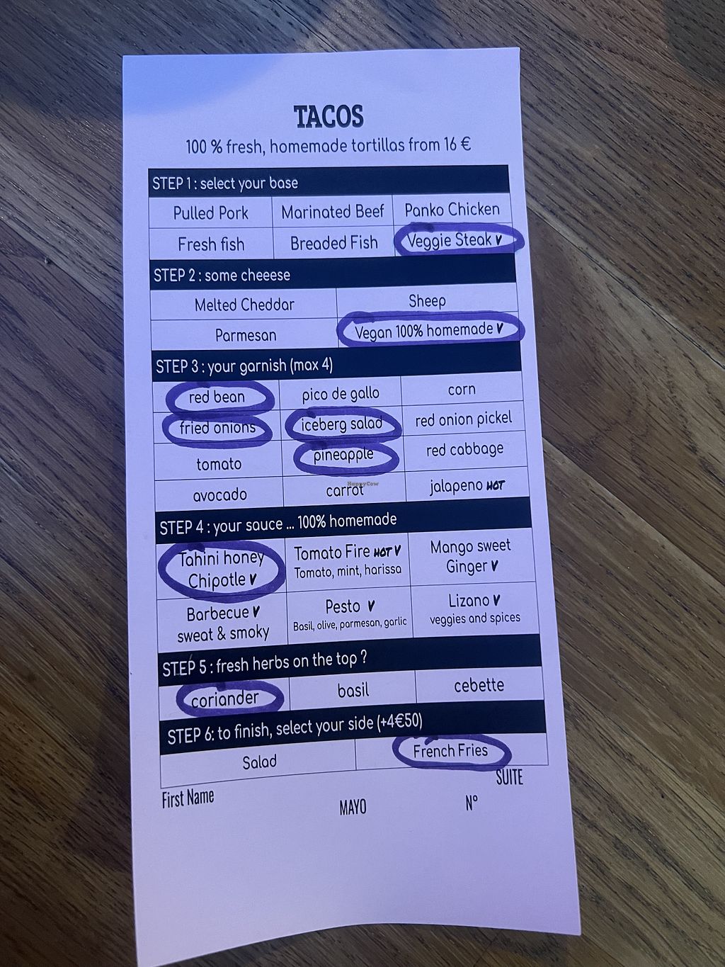 Another super nice place in Biarritz, where you can find vegan tacos, you choose the ingredients for the tacos from a list.