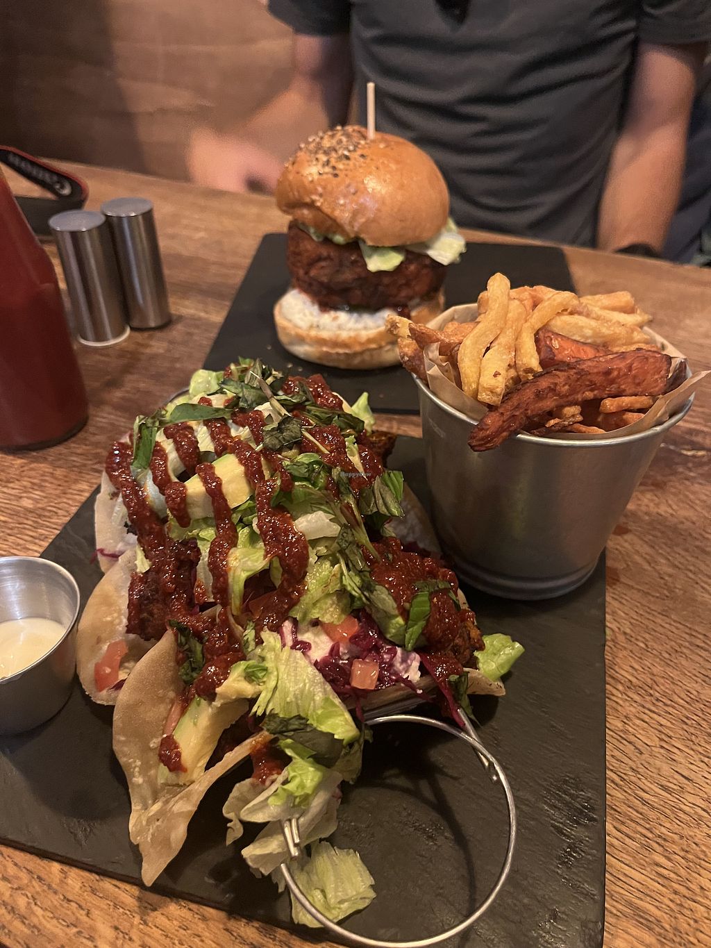 It is ok for pub food, but the tacos lacked flavor. Better tacod elsewhere to be found. The burger bun was cold and the fries are soggy. The burger sauces are not labelled so you have to ask. The tomatoes were unripe and lacked taste. Homemade orangina was good. Nice atmosphere, but certainly better for just drinking after eating somewhere else :)